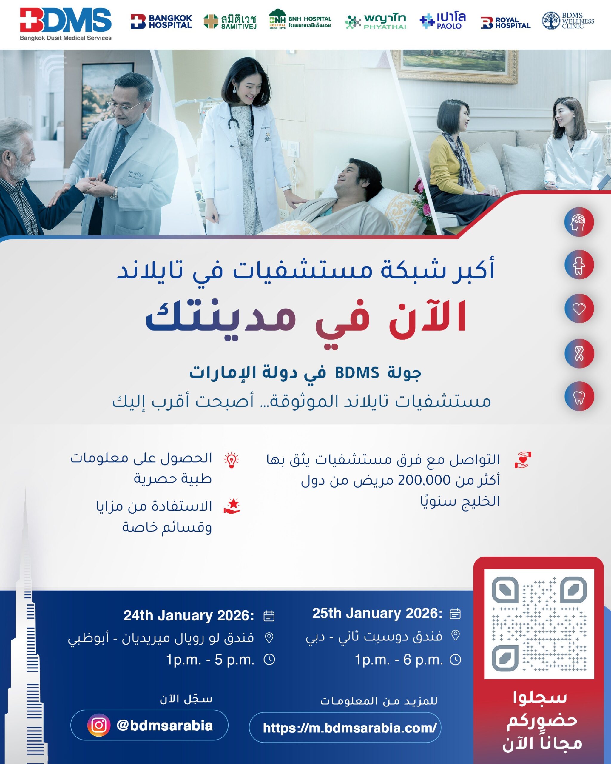 جولة BDMS في دولة الإمارات< 1 قراءة في دقيقة (دقائق)معلومات منBangkok Hospital Phuketتم التحديث في: 12 يناير 2026الباقات الموصى بهاHealth Check Up Packages at Wellness CenterBangkok Hospital Phuketتم التحديث في: 12 يناير 2026 REGISTER NOW الباقات والعروضHealth Check Up Packages at Wellness Center2,750 بات5,250 باتتفاصيلالمزيد من الباقاتالأخبار والفعالياتمشاهدة الكلالأخبار والفعالياتخدمات الرعاية الصحية والعافية للمغتربين في بوكيت من خلال شبكة مستشفيات بانكوك في بوكيتمجتمع المغتربين الروس الذين انضموا إلى دورة دعم الحياة الأساسية (CPR/AED)!BDMS تتعاون مع مجموعة MEDSI لتوقيع مذكرة تفاهم لتعزيز التعاون في الطب والتسويق والعمليات والسياحةمشاهدة الكل