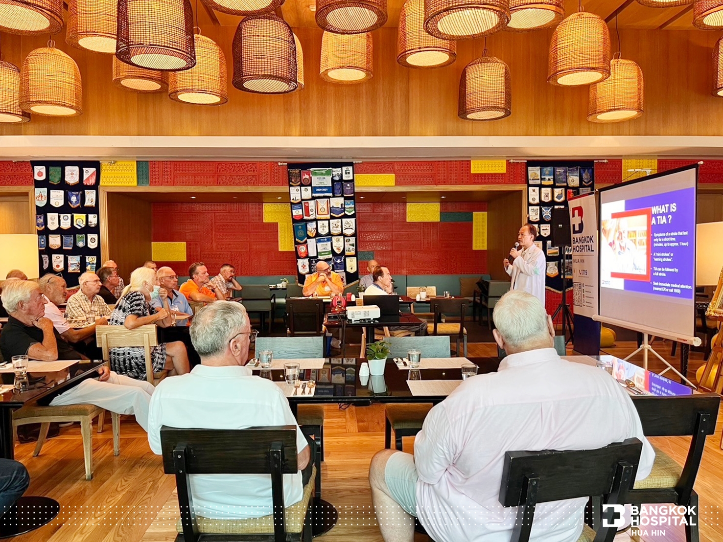 Dr. Ruangvuth Tantibhaedhyangkul, a neurologist at Bangkok Hospital Hua Hin, was the guest speaker discussing the topic of “Introduction to Stroke” with the Rotary Club of Royal Hua Hin. Dr. Pongsak Boonyaleephun, Assistant Hospital Director of Bangkok Hospital Hua Hin, also attended this meeting and Mr. Brian Anderson, President of the Rotary Club of Royal Hua Hin, warmly welcomed at Amari Hua Hin on March 12, 2024.
