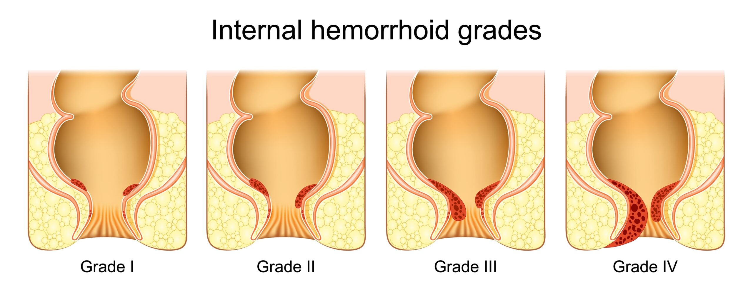 Hämorrhoiden werden in zwei Typen unterteilt: Äußere Hämorrhoiden erscheinen als geschwollene Knoten rund um den After, die jederzeit spürbar sind und oft Schmerzen verursachen. Innere Hämorrhoiden befinden sich im After und werden in vier Stadien unterteilt: