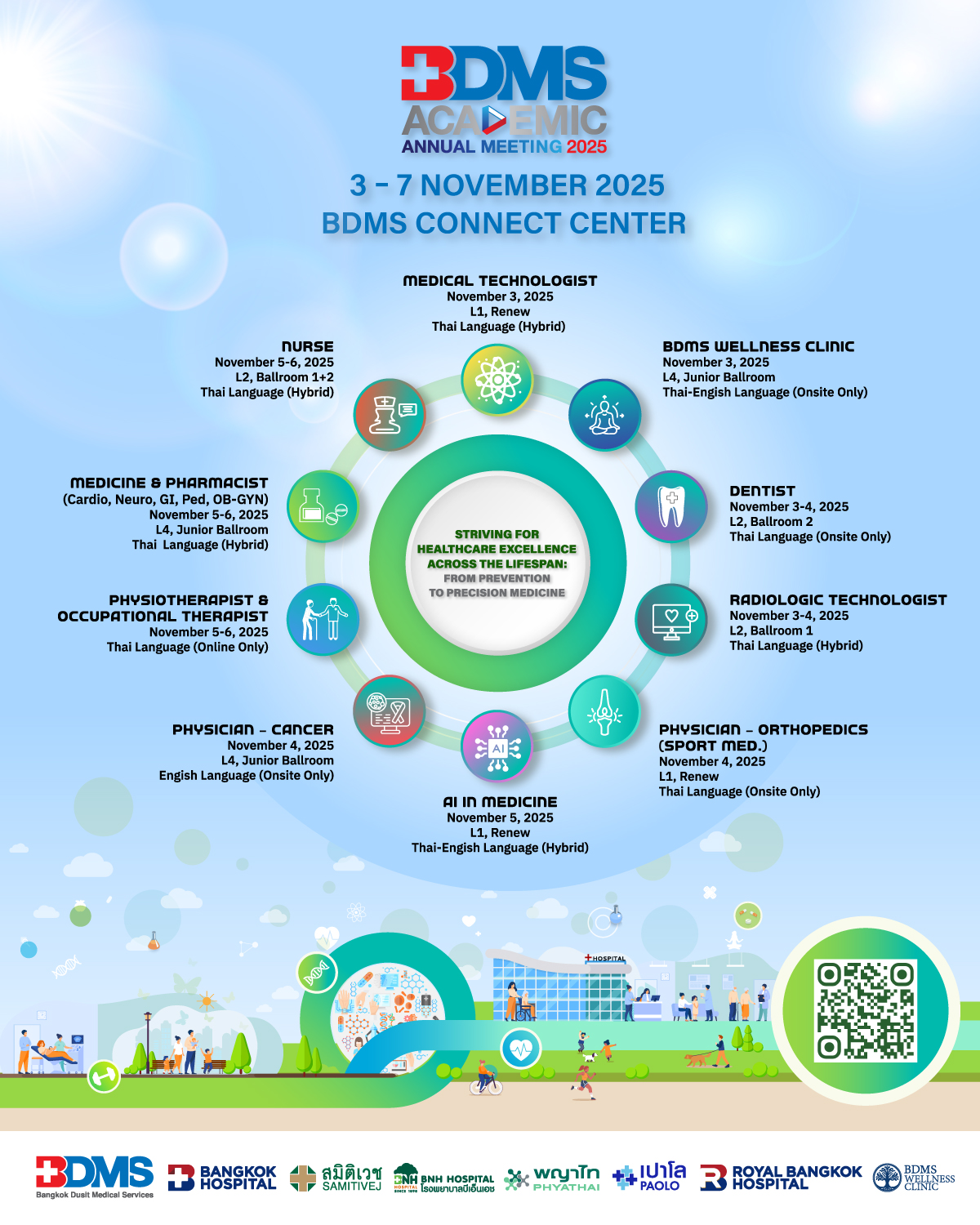 Bangkok Dusit Medical Services Public Company Limited (BDMS) cordially invites physicians, dentists, nurses, pharmacists, radiologic technologists, physical therapists, occupational therapists, healthcare professionals, and all interested participants to join the BDMS Academic Annual Meeting 2025, to be held from 3–7 November 2025 at BDMS Connect Center.