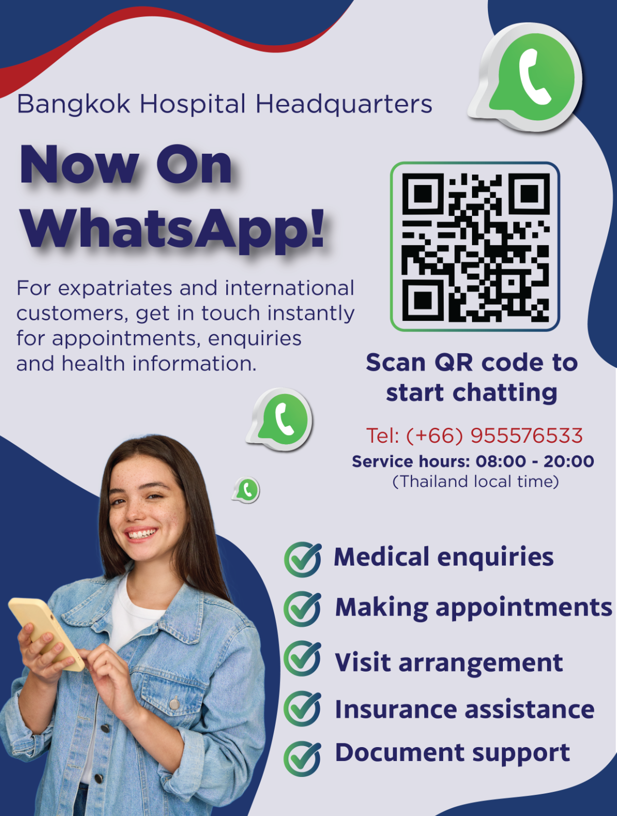 Our official WhatsApp Business account is now available for expatriates and international customers of Bangkok Hospital Headquarters. Connect with us instantly for health information and medical assistance.