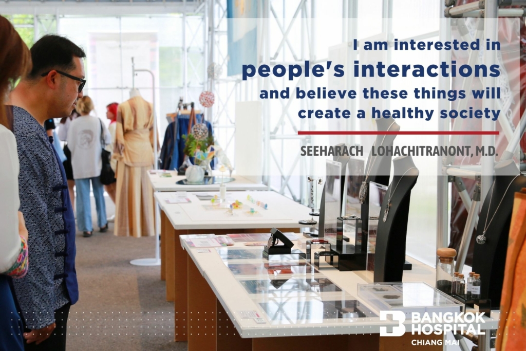 Conversations flowed smoothly as we walked through the exhibition, only interrupted by asking questions about his interests as he walked through each booth. He made an attempt to comprehend the Lanna people’s way of life by pausing to look at the designs on textiles, silverware, and traditional candle holder, as well as by taking part in the distribution of green places in Chiang Mai. We couldn’t resist asking him for his people’s perspectives from the angles of a ‘doctor’ and a ‘hospital director’.
