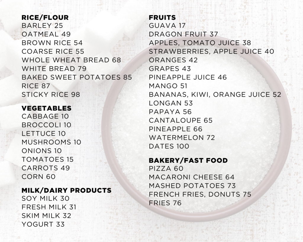 The Glycemic Index (GI) is a measure of how quick blood sugar levels rise within a few hours after consuming carbohydrate-containing food. It can be divided into 3 levels as follow: