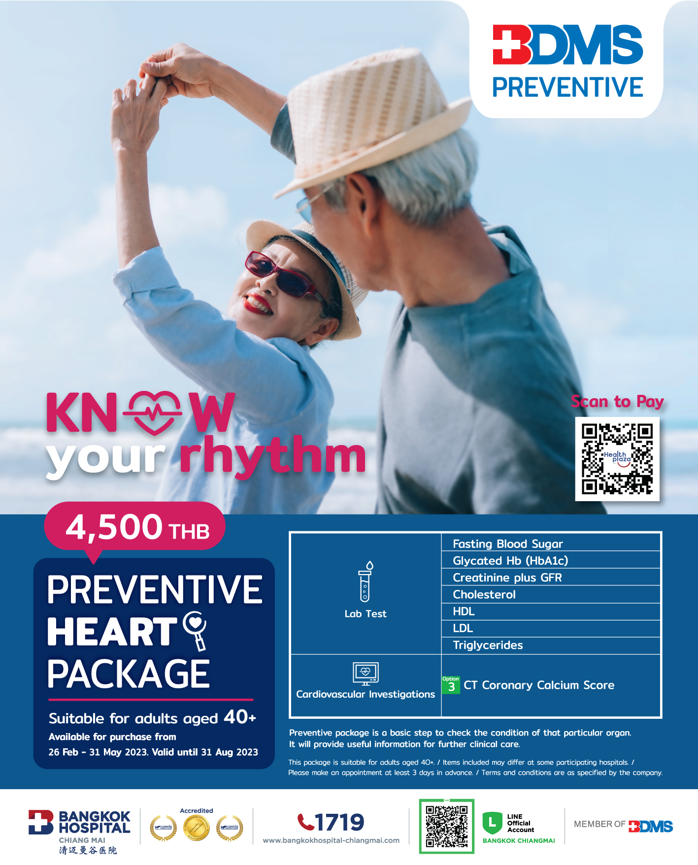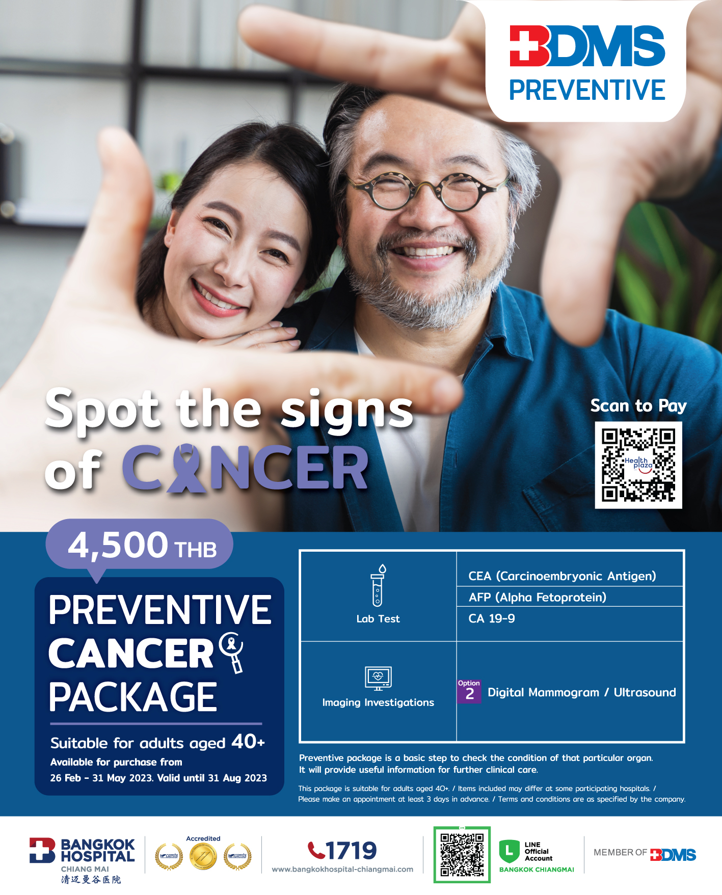 For more purchasing information for the BDMS Preventive Heart Package or BDMS Preventive Cancer Package, please call 052 089 888 or Call Center 1719. Click here to make an online purchase from February 26 to May 31, 2023. This package is valid until August 31, 2023.