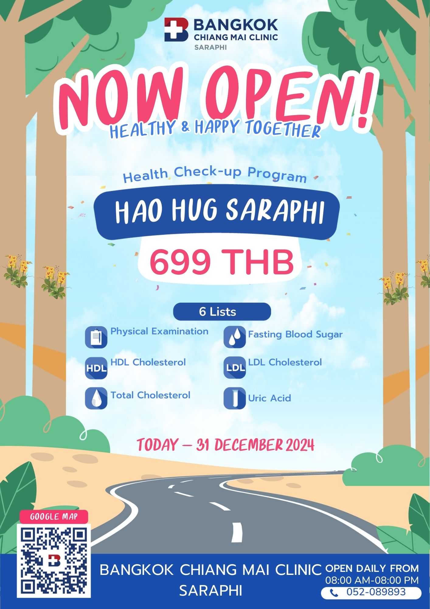 Delivering a health check program at an attractive price “Hao Hug Saraphi” allows Saraphi residents aged 15 years and over to see a doctor for a health check. Check the blood sugar level. Blood cholesterol levels High-density lipoprotein (good) cholesterol, low-density lipoprotein (bad), and uric acid levels in the blood. Get lab results from a laboratory that meets international standards. From today until December 2024