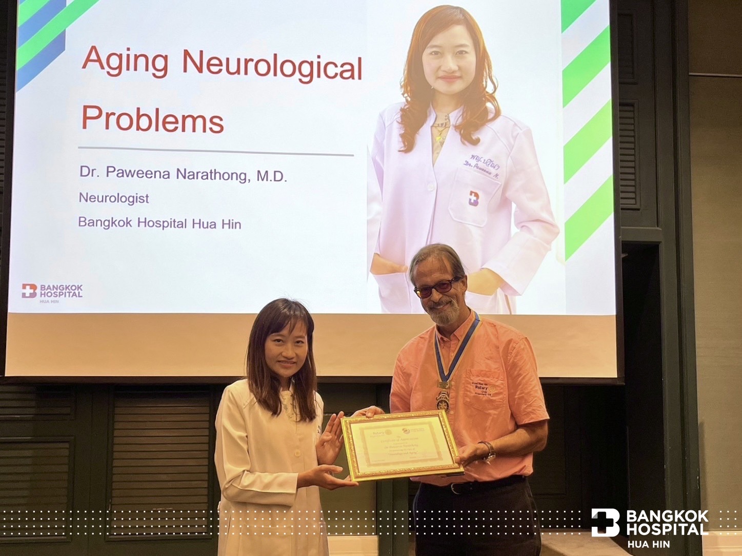 Dr. Paweena Narathong, a neurologist at Bangkok Hospital Hua Hin, was the guest speaker discussing the topic of “Aging Neurological Problems” with the Rotary Club of Royal Hua Hin. Dr. Pongsak Boonyaleephun, Assistant Hospital Director of Bangkok Hospital Hua Hin, also attended this meeting and Prof. Dr. Helmut Schepers, President of the Rotary Club of Royal Hua Hin, warmly welcomed at Amari Hua Hin on September 12th, 2023.
