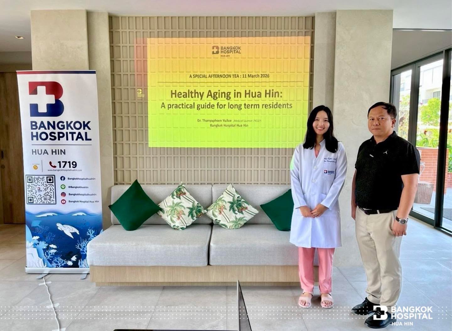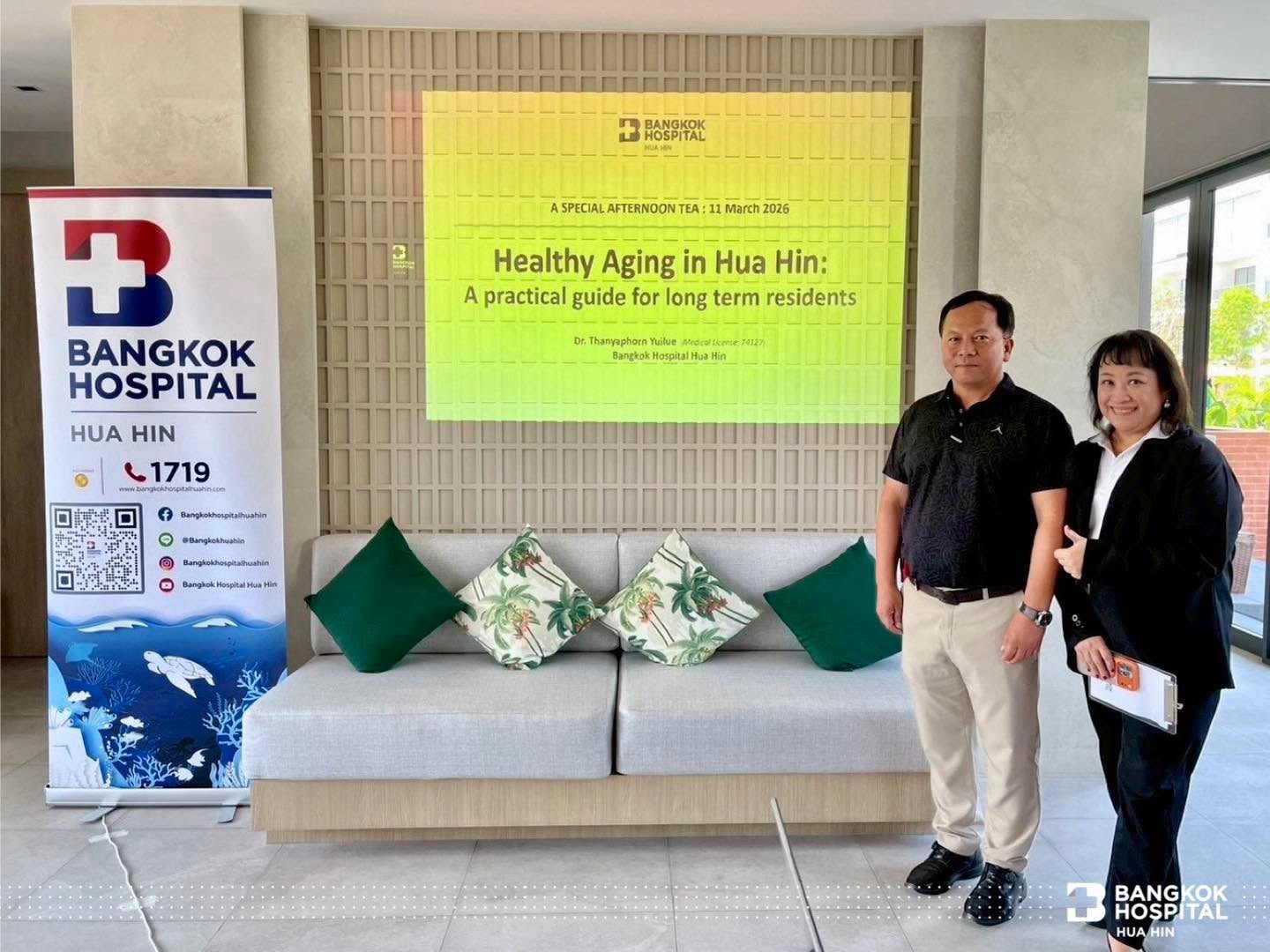 Khun Niranuch Banasanprasit, Director of International Patient Experience, Bangkok Hospital Hua Hin, and Dr. Thanyaphorn Yuilue (Medical License No. 74127), our General Practitioner, International Medical Coordinator Center (IMCC), delivered a talk on “Healthy Aging in Hua Hin: A practical guide for long term residents” to the residents of the Sunshine International on March 11, 2026.
