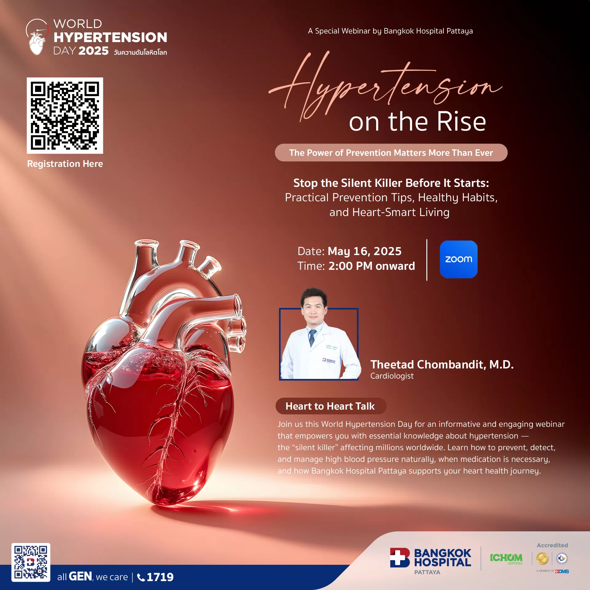 A Special Webinar by Bangkok Hospital Pattaya Hypertension< 1 minute(s) readInformation byBangkok Hospital PattayaUpdated on: 10 Sep 2025Recommended PackagesHealthy Elite PackagesAll Heart Matter PackagesAll Heart Matter PackagesBangkok Hospital PattayaUpdated on: 10 Sep 2025Packages & PromotionsHealthy Elite Packages135,555 BahtDetailBuy NowAll Heart Matter Packages4,000 BahtDetailBuy NowAll Heart Matter Packages4,000 BahtDetailBuy NowMore packagesNews & EventsSee AllNews & EventsYour Health Your Home One Click Consult with our specialist doctors online throughProudly Recognized on the Global Stage for Stroke Care ExcellenceBDMS Easter Trauma Network 2025 - The Trauma Code – Mass Casualty Incident and Disaster PreparednessSee All
