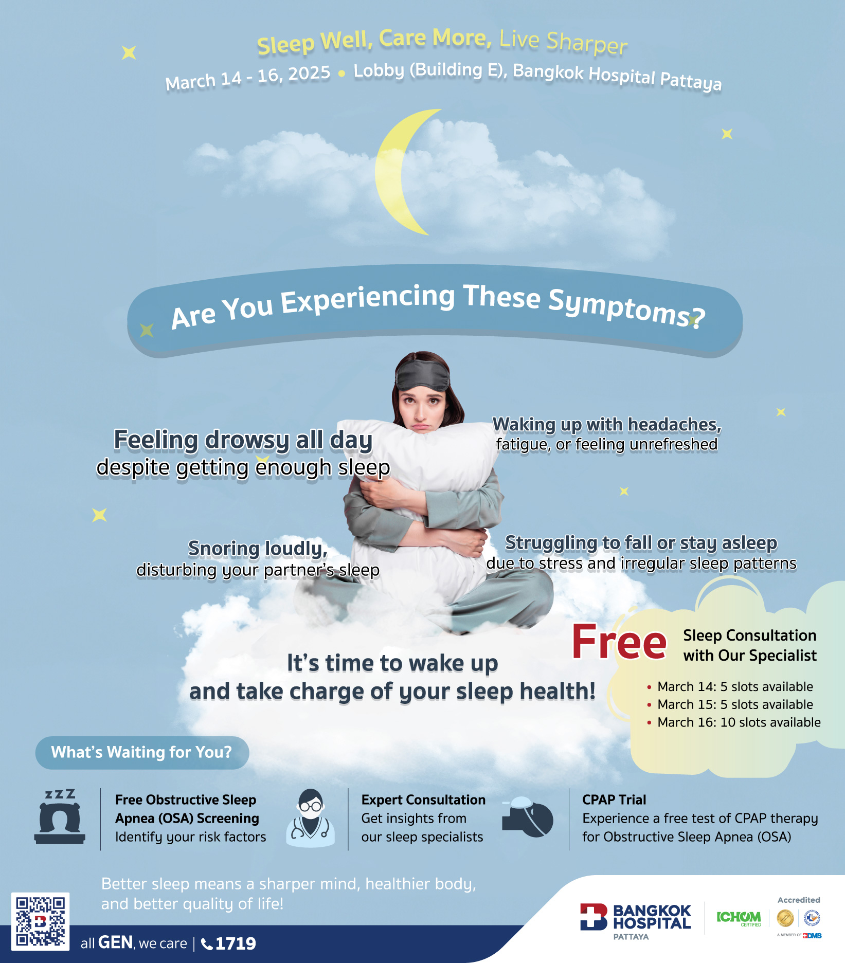 Sleep Smart Live Sharp Sleep Well, Care More, Live Sharper< 1 minute(s) readInformation byBangkok Hospital PattayaUpdated on: 10 Sep 2025Recommended PackagesHealthy Elite PackagesAll Heart Matter PackagesAll Heart Matter PackagesBangkok Hospital PattayaUpdated on: 10 Sep 2025Packages & PromotionsHealthy Elite Packages135,555 BahtDetailBuy NowAll Heart Matter Packages4,000 BahtDetailBuy NowAll Heart Matter Packages4,000 BahtDetailBuy NowMore packagesNews & EventsSee AllNews & EventsYour Health Your Home One Click Consult with our specialist doctors online throughProudly Recognized on the Global Stage for Stroke Care ExcellenceBDMS Easter Trauma Network 2025 - The Trauma Code – Mass Casualty Incident and Disaster PreparednessSee All