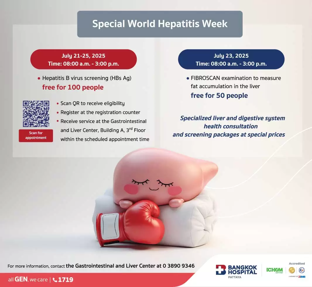 World Hepatitis Month 2025 Rest your liver take a break Abstain from drinking, and turn to caring for liver health< 1 minute(s) readInformation byBangkok Hospital PattayaUpdated on: 10 Sep 2025Recommended PackagesHealthy Elite PackagesAll Heart Matter PackagesAll Heart Matter PackagesBangkok Hospital PattayaUpdated on: 10 Sep 2025Packages & PromotionsHealthy Elite Packages135,555 BahtDetailBuy NowAll Heart Matter Packages4,000 BahtDetailBuy NowAll Heart Matter Packages4,000 BahtDetailBuy NowMore packagesNews & EventsSee AllNews & EventsYour Health Your Home One Click Consult with our specialist doctors online throughProudly Recognized on the Global Stage for Stroke Care ExcellenceBDMS Easter Trauma Network 2025 - The Trauma Code – Mass Casualty Incident and Disaster PreparednessSee All