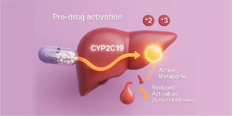 Clopidogrel requires activation by the CYP2C19 enzyme. Loss-of-function alleles can reduce active metabolite exposure 5 to 10-fold.