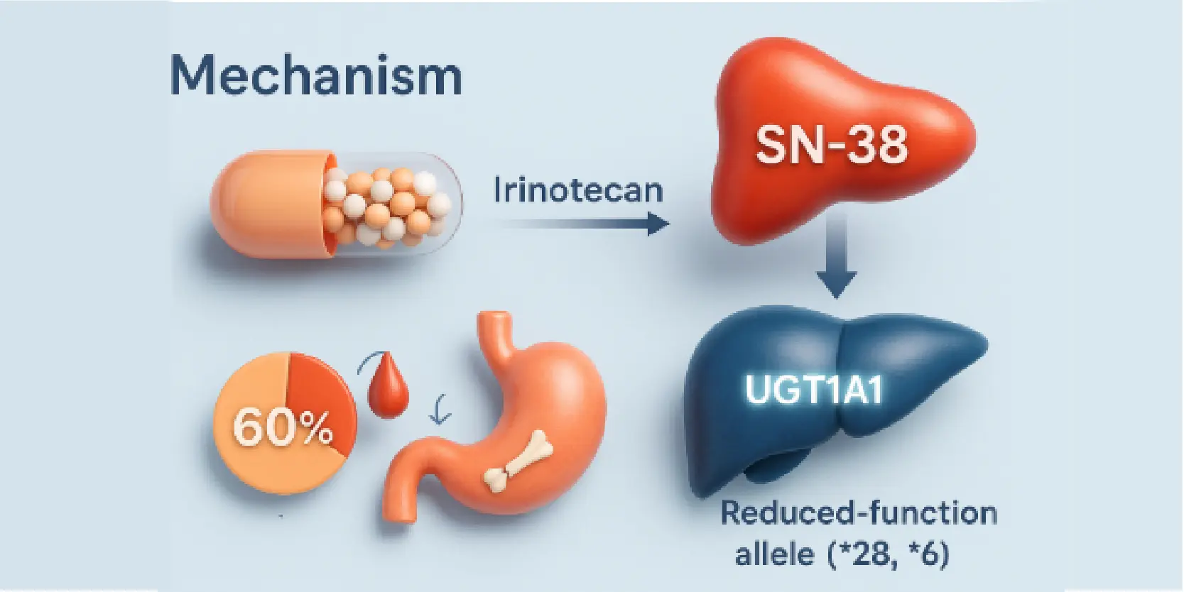 Irinotecan’s active metabolite (SN-38) is inactivated by UGT1A1. Reduced-function alleles (*28, *6) slow this process, increasing SN-38 exposure and the risk of severe side effects.