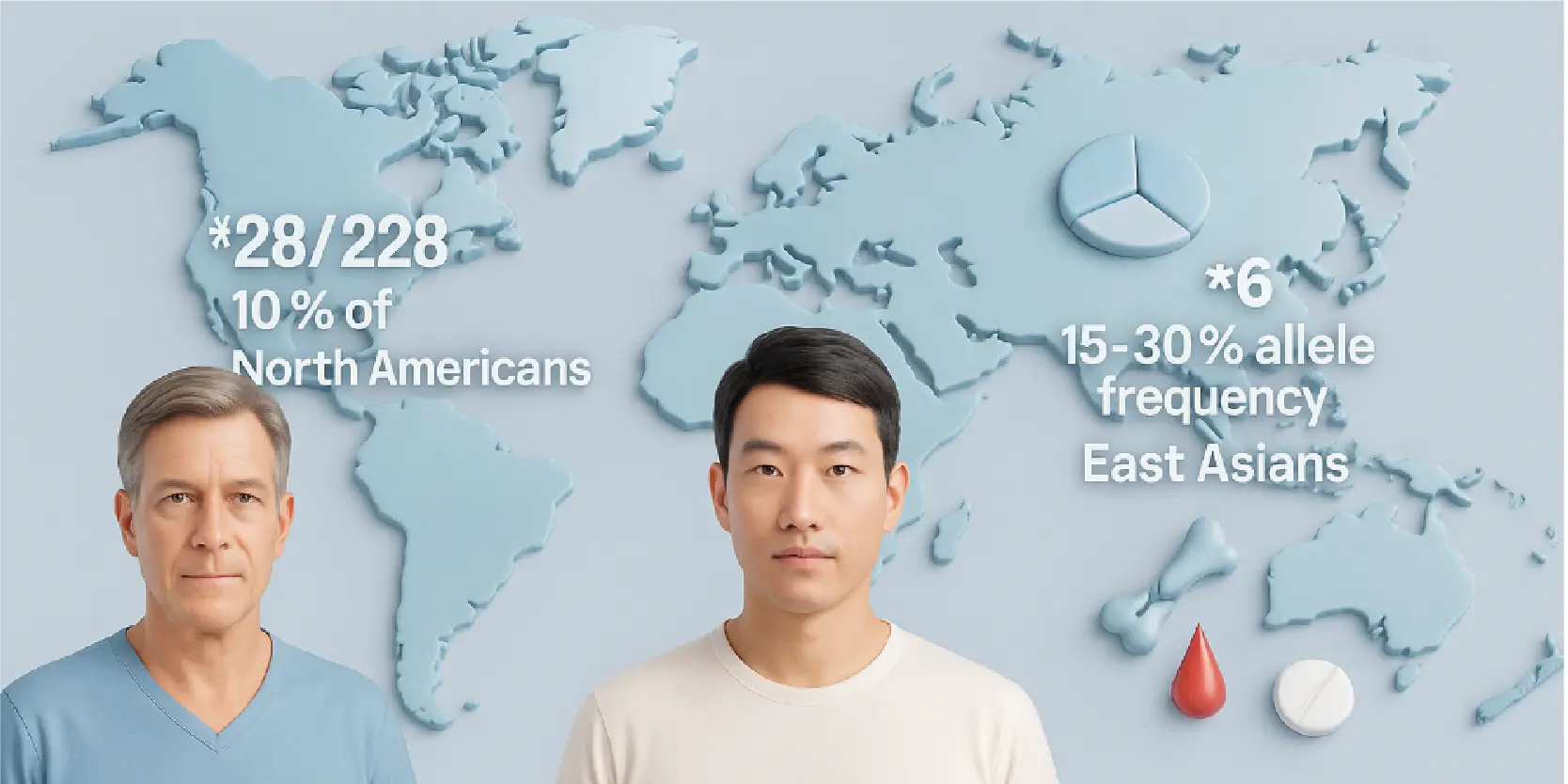 About 10% of North Americans are *28/*28 homozygotes. The *6 allele is common in East Asians (15-30%), predicting higher toxicity risk in these groups.