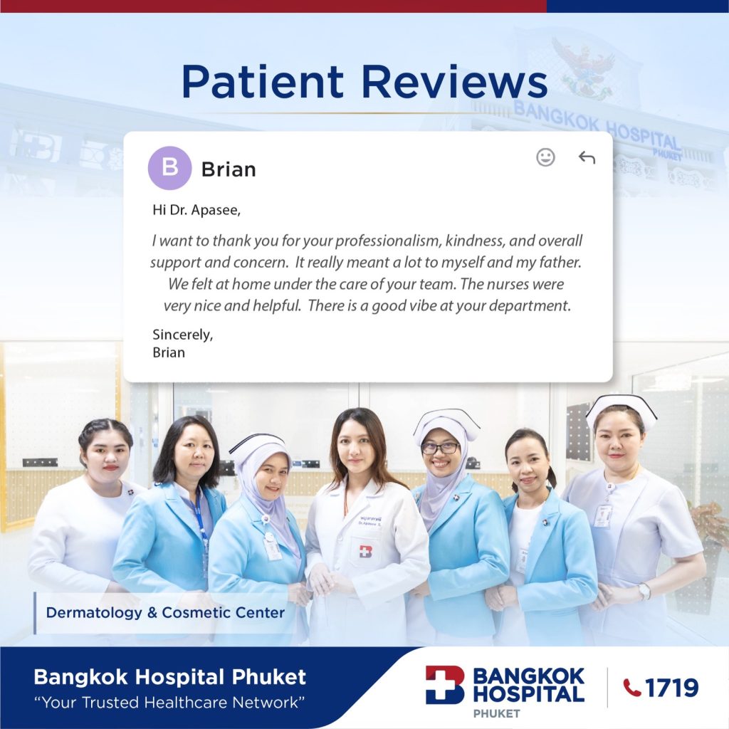 Bangkok Hospital Phuket is a destination for patients seeking expert skin cancer care from across Thailand and around the world. Whether you are a local resident or traveling from abroad, our team is committed to delivering high-quality, patient-centered care in a safe, modern facility.