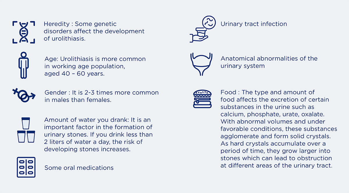 Urolithiasis is caused by a number of factors, such as environmental factors, metabolism, genetics, lifestyle and eating habits of the patient.