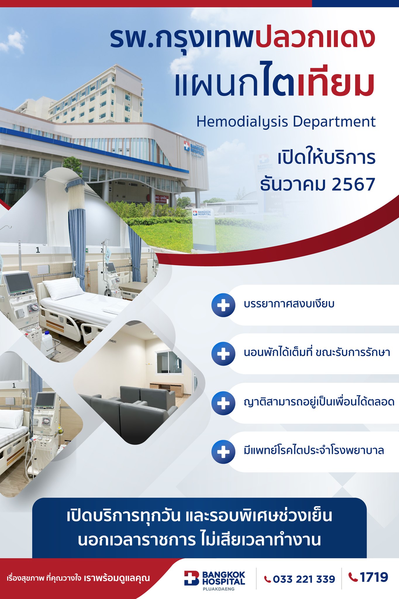 - Hemodialysis Center, Bangkok Pluak Daeng Hospital provides renal replacement therapy through hemodialysis for patients with acute kidney injury and end-stage chronic kidney disease.