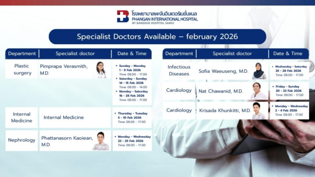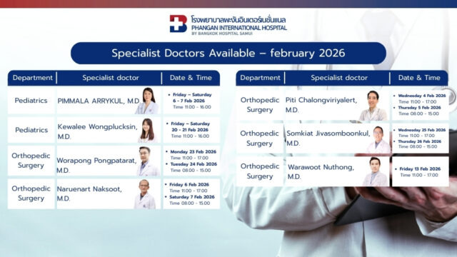 Phangan International Hospital offers services by specialist physicians as of February 2026.