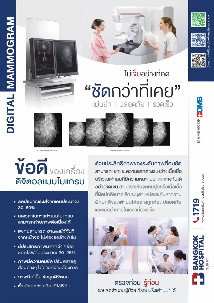 Mammogram< 1 minute(s) readInformation byDr. Kitti UbonkanBangkok Hospital SuratDr. Srikanya RuangsriBangkok Hospital Surat28 Nov 2025Dr. Kitti UbonkanBangkok Hospital SuratBangkok Hospital SuratUpdated on: 28 Nov 2025 Information byDr. Kitti UbonkanSurgeryDr. Kitti UbonkanSurgeryProfileCallDr. Srikanya RuangsriFamily MedicineDr. Srikanya RuangsriFamily MedicineProfileCallFor more information, please contactศูนย์ส่งเสริมสุขภาพอาคารบริการชั้น 2
