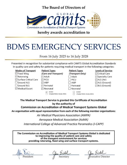 certified by CAMTS Global (Commission on Accreditation of Medical Transport Systems Global)