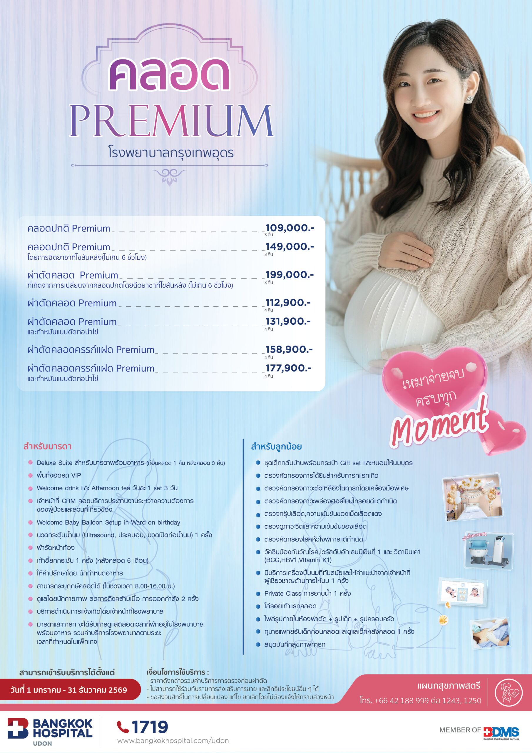 • มารดาและทารกจะได้รับการดูแลตลอดเวลาที่พักอยู่ในโรงพยาบาล พร้อมอาหาร รวมค่าบริการโรงพยาบาลตามระยะเวลาที่กำหนดในแพ็กเกจ