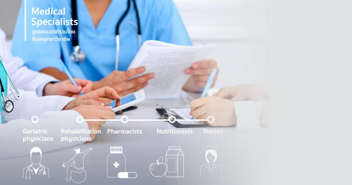 - การดูแลแบบองค์รวม โดยอายุรแพทย์เวชศาสตร์ผู้สูงอายุ แพทย์เวชศาสตร์ฟื้นฟู ทีมนักกายภาพบำบัด (รวมถึง นักกิจกรรมบำบัด นักอรรถบำบัด) เภสัชกร นักโภชนาการ และพยาบาลวิชาชีพ พร้อมวางแผนการดูแลอย่างต่อเนื่อง และมีการประชุมร่วมกันเพื่อติดตามการรักษาอย่างใกล้ชิด