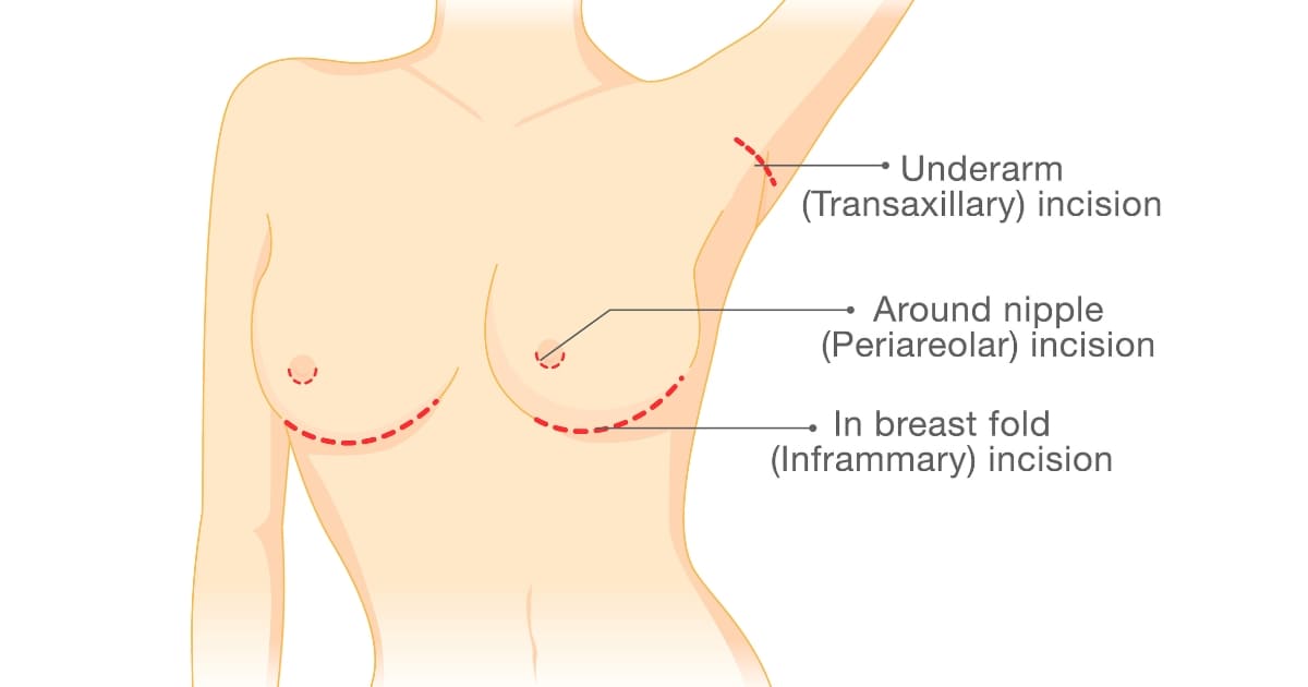 การผ่าตัดเสริมหน้าอกสามารถเลือกบริเวณของแผลผ่าตัดที่จะใช้ในการใส่ซิลิโคนได้ ประกอบไปด้วย