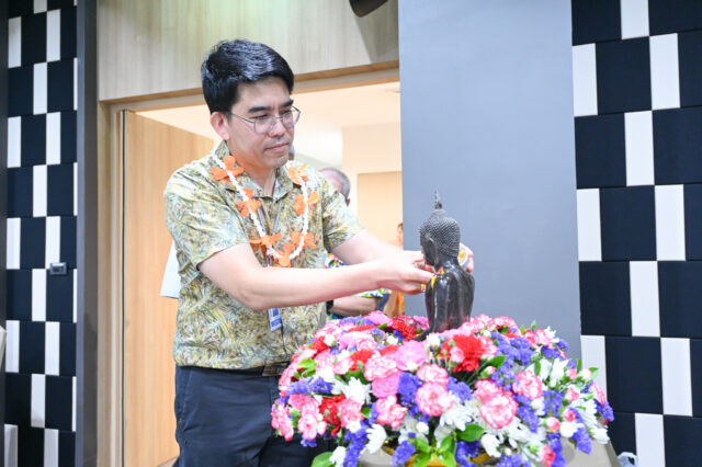 นอกจากนี้ ยังได้จัดให้มีกิจกรรมสรงน้ำพระ และพิธีรดน้ำขอพรผู้ใหญ่ เพื่อความเป็นสิริมงคลและเป็นขวัญกำลังใจในการปฏิบัติงาน โดยผู้เข้าร่วมงานได้ร่วมใจกันแต่งกายด้วยเสื้อลายดอกสีสันสดใส ซึ่งไม่เพียงแต่เป็นการสืบสานวัฒนธรรมไทย แต่ยังช่วยกระชับความสัมพันธ์และความสามัคคีของบุคลากรภายในองค์กรให้แน่นแฟ้นยิ่งขึ้น ณ ห้องประชุมจันทบูร ชั้น 9 อาคาร B