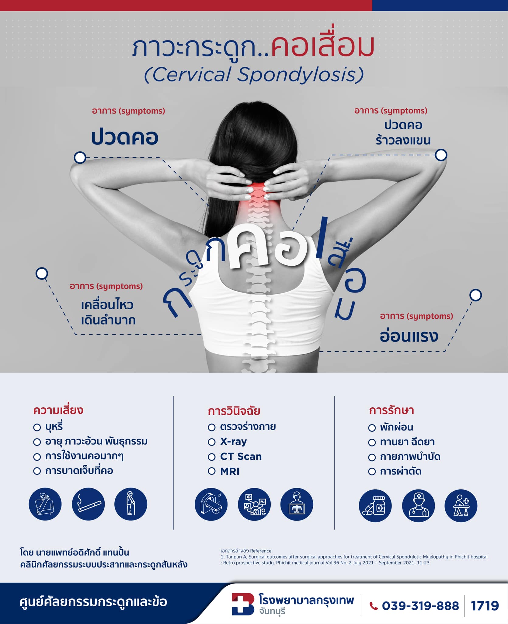 เมื่ออายุมากขึ้น ความเสี่ยงเรื่องกระดูกคอเสื่อมก็มากขึ้นตามไปด้วย นอกจากนี้ยังอาจมีการงอกของกระดูก ซึ่งหากไปกดทับเส้นประสาทและไขสันหลังก็จะทำให้เกิดอาการปวด ชาตามแขนและมือ และมักต่อด้วยอาการกล้ามเนื้ออ่อนแรงในระยะต่อมา