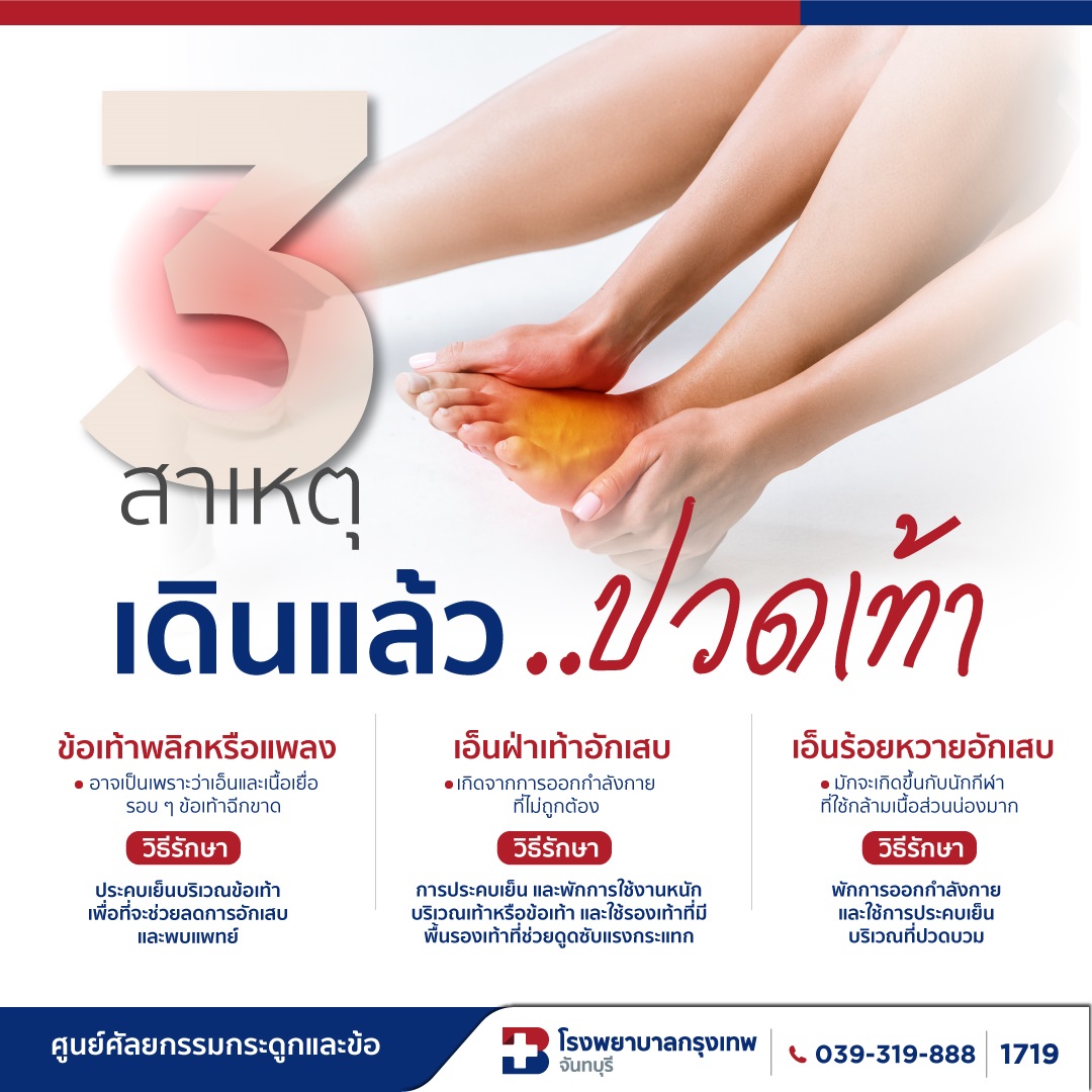 3 สาเหตุ เดินแล้ว...ปวดเท้า< 1 นาทีในการอ่านข้อมูลโดยโรงพยาบาลกรุงเทพจันทบุรีอัปเดตเมื่อ: 08 ต.ค. 2568โรงพยาบาลกรุงเทพจันทบุรีอัปเดตเมื่อ: 08 ต.ค. 2568 สอบถามเพิ่มเติมที่คลินิกศัลยกรรมเท้าและข้อเท้า1st Floor, Building A08.00 - 20.00 น.039-319-888[email protected]แพทย์ที่เกี่ยวข้องดูแพทย์ทั้งหมดข้อมูลสุขภาพดูข้อมูลสุขภาพอื่น ๆข้อมูลสุขภาพ3 ระดับความรุนแรงของข้อเท้าแพงการผ่าตัดรักษานิ้วหัวแม่เท้าเกรุนแรง (Hallux Valg)ภาวะเท้าแบนในเด็กและวัยรุ่นดูข้อมูลสุขภาพอื่น ๆ