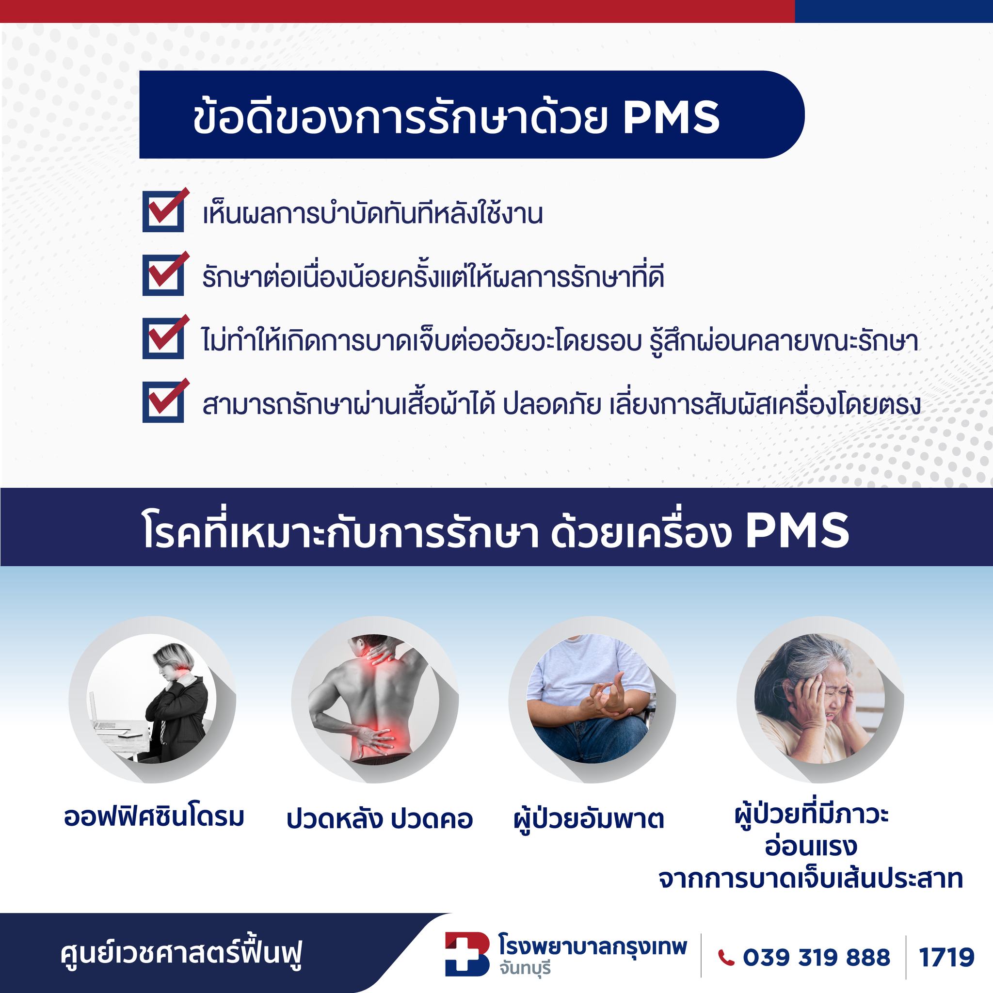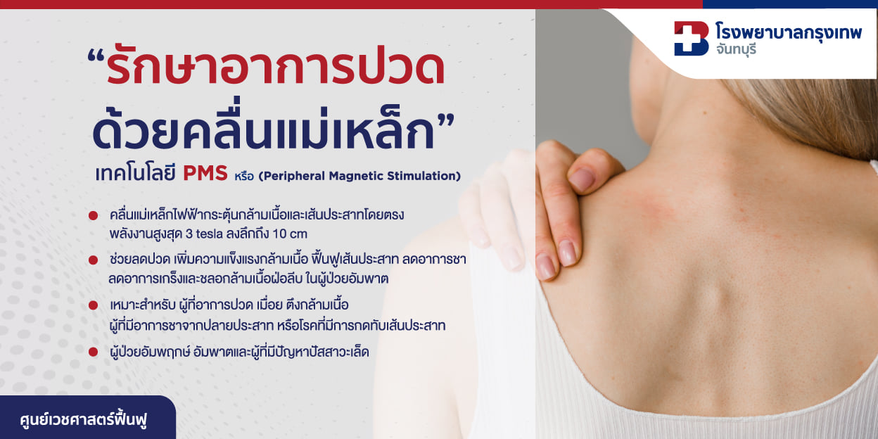 รักษาอาการปวดด้วยคลื่นแม่เหล็ก< 1 นาทีในการอ่านข้อมูลโดยโรงพยาบาลกรุงเทพจันทบุรีอัปเดตเมื่อ: 08 ต.ค. 2568โรงพยาบาลกรุงเทพจันทบุรีอัปเดตเมื่อ: 08 ต.ค. 2568 สอบถามเพิ่มเติมที่แผนกกายภาพบำบัด4nd Floor, Building B08.00-19.00 น.039-319-888[email protected]แพทย์ที่เกี่ยวข้องดูแพทย์ทั้งหมดข้อมูลสุขภาพดูข้อมูลสุขภาพอื่น ๆข้อมูลสุขภาพโรงพยาบาลกรุงเทพจันทบุรี พร้อมดูแลผู้บาดเจ็บจากการกีฬา ด้วยเทคโนโลยีทันสมัยการรักษาด้วยคลื่นกระแทกการออกำลังกายเพื่อลดปวดคอ บ่า ไหล่ดูข้อมูลสุขภาพอื่น ๆ