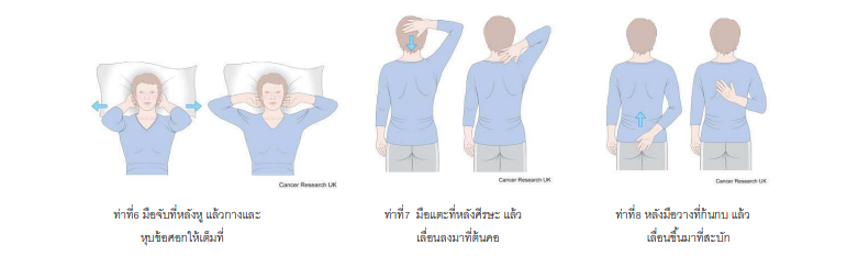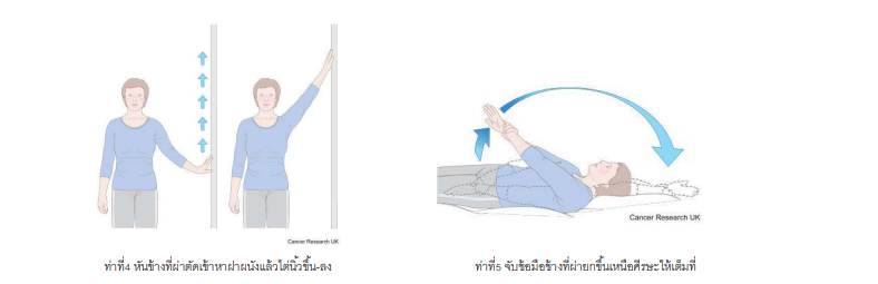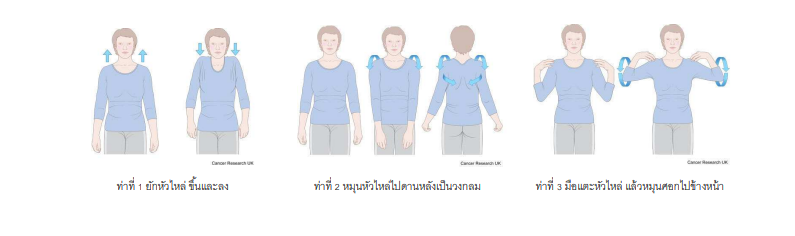 - หากต้องนั่งเป็นเวลานานมากกว่า 1 ชั่วโมง ควรยกแขนข้างที่ผ่าตัดให้สูงกว่าระดับหัวใจ ร่วมกับมีการเคลื่อนไหวของแขนข้างนั้นเป็นครั้งคราว เพื่อลดการบวมของแผลผ่าตัด