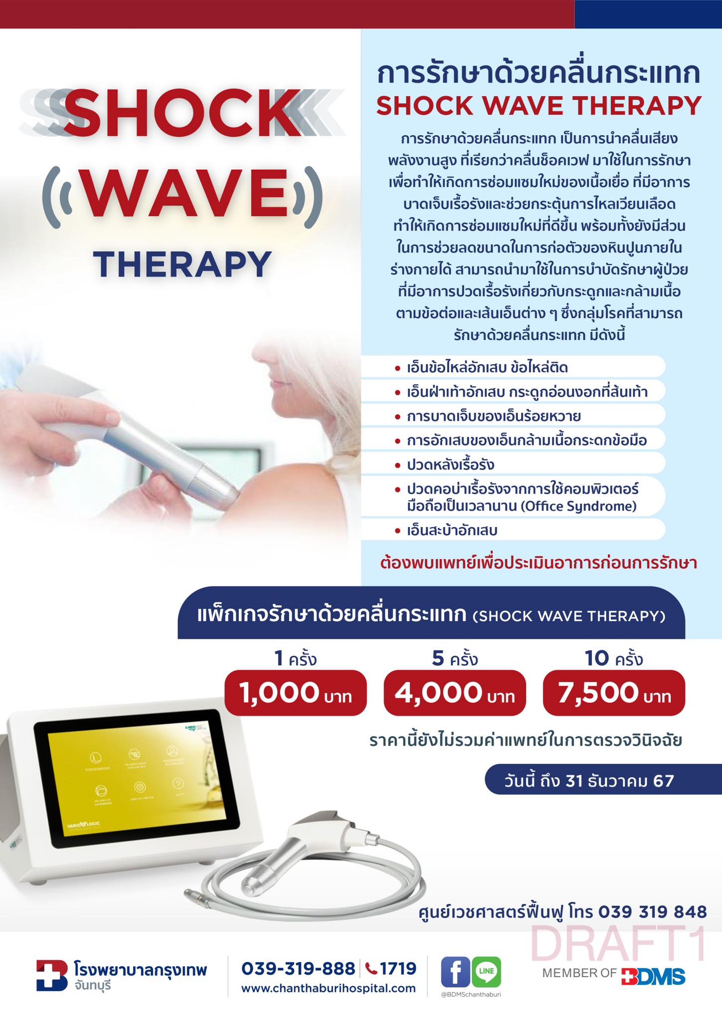 การรักษาด้วยคลื่นกระแทก< 1 นาทีในการอ่านข้อมูลโดยโรงพยาบาลกรุงเทพจันทบุรีอัปเดตเมื่อ: 08 ต.ค. 2568โรงพยาบาลกรุงเทพจันทบุรีอัปเดตเมื่อ: 08 ต.ค. 2568สอบถามเพิ่มเติมที่แผนกกายภาพบำบัด4nd Floor, Building B08.00-19.00 น.039-319-888[email protected]แพทย์ที่เกี่ยวข้องดูแพทย์ทั้งหมดข้อมูลสุขภาพดูข้อมูลสุขภาพอื่น ๆข้อมูลสุขภาพโรงพยาบาลกรุงเทพจันทบุรี พร้อมดูแลผู้บาดเจ็บจากการกีฬา ด้วยเทคโนโลยีทันสมัยการออกำลังกายเพื่อลดปวดคอ บ่า ไหล่การออกกำลังกายหลังผ่าตัดเต้านมดูข้อมูลสุขภาพอื่น ๆ