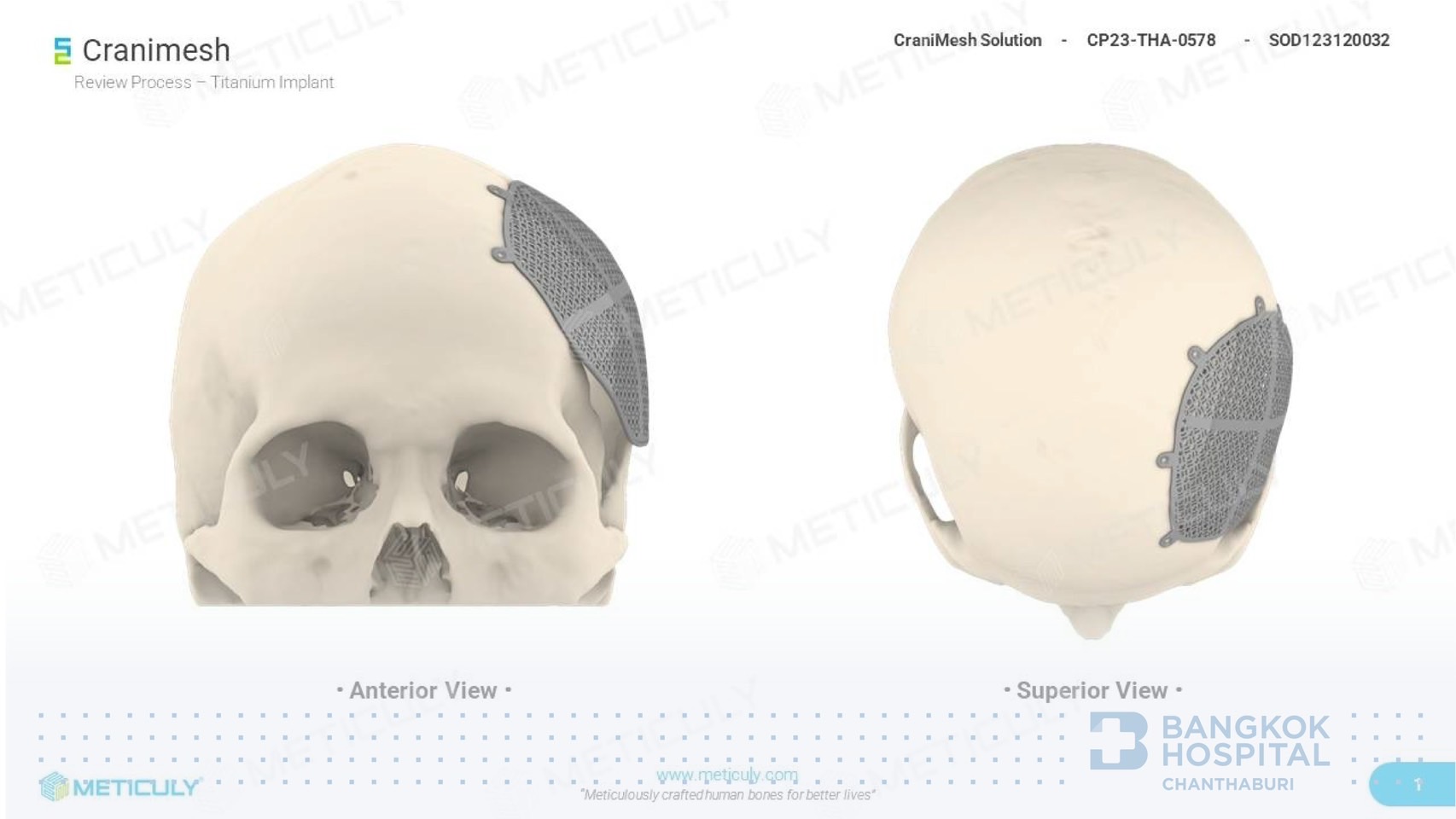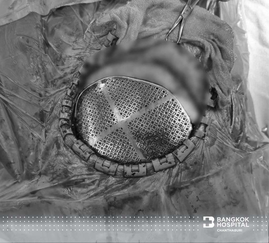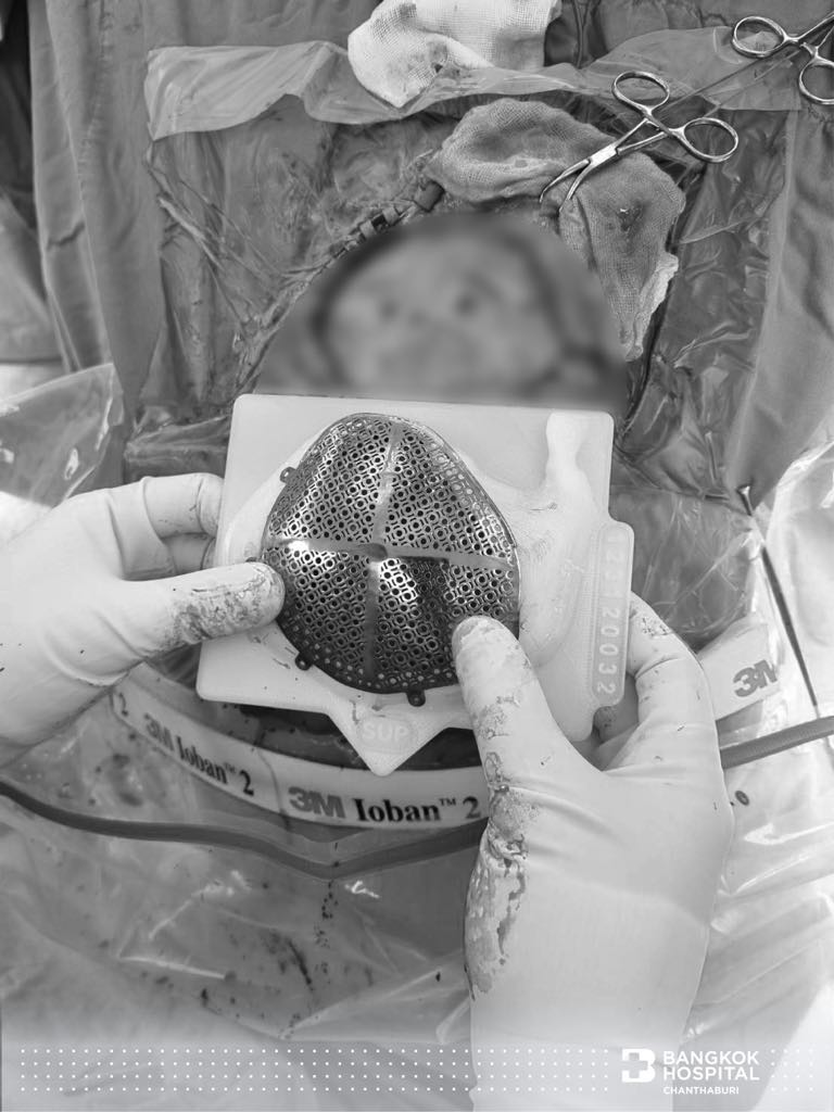 นวัตกรรมนี้ถือเป็นหนึ่งในความก้าวหน้าของเทคโนโลยีทางการแพทย์ โดยการใช้กะโหลกเทียมไทเทเนียมที่ออกแบบเฉพาะบุคคล เพื่อแก้ไขความผิดรูปของศีรษะจากสาเหตุต่าง ๆ ซึ่งที่พบบ่อยคือ ปัญหาศีรษะผิดรูปหลังได้รับการผ่าตัดเปิดกะโหลกเพื่อนำเลือดที่ออกในสมองออก ร่วมกับการเปิดกะโหลกไว้เพื่อระบายแรงดันในสมอง นอกจากนี้ยังเป็นนวัตกรรมที่ช่วยลดอันตรายที่อาจเกิดจากการเปิดกะโหลกศีรษะไว้ และยังช่วยดูแลเรื่องภาพลักษณ์ของผู้ป่วยหลังได้รับการรักษาด้วยการผ่าตัดเปิดกะโหลกอีกด้วย #ข้อดีของการปิดกะโหลกศีรษะด้วยไทเทเนียม นอกจากจะได้รูปทรงที่สวย ตรงตามสรีระของผู้ป่วย วัสดุยังมีความแข็งแรง คงทน มีโอกาสติดเชื้อลดลง เพราะวัสดุไทเทเนียมลดการเกิดไบโอฟิล์ม ชั้นบาง ๆ บนพื้นผิววัสดุที่เกิดจากการรวมตัวกันของจุลินทรีย์ ซึ่งเป็นสาเหตุหนึ่งของการติดเชื้อ