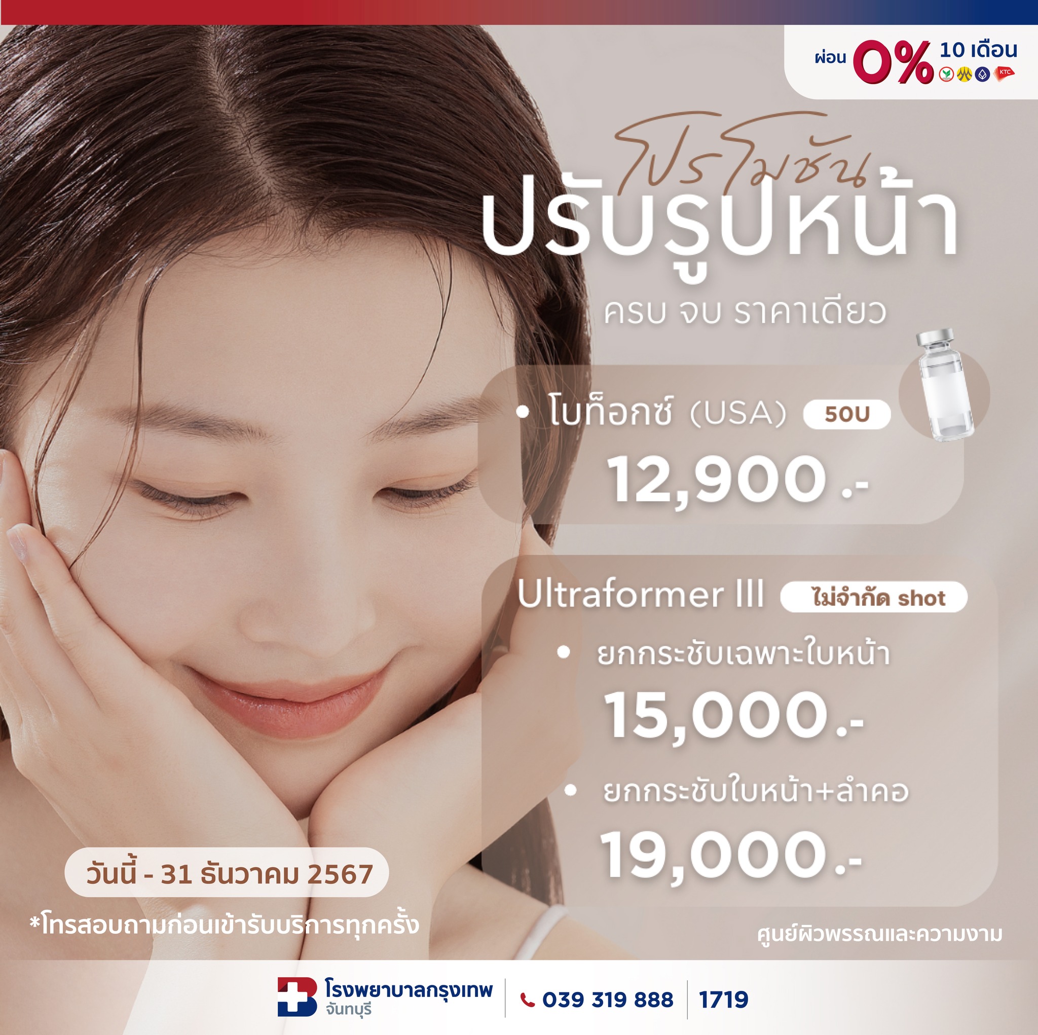 ทั้งนี้ ‘การฉีดโบท็อกซ์และ ultraformer ควรทำโดยแพทย์ผู้เชี่ยวชาญและมีประสบการณ์’ ที่โรงพยาบาลกรุงเทพจันทบุรี