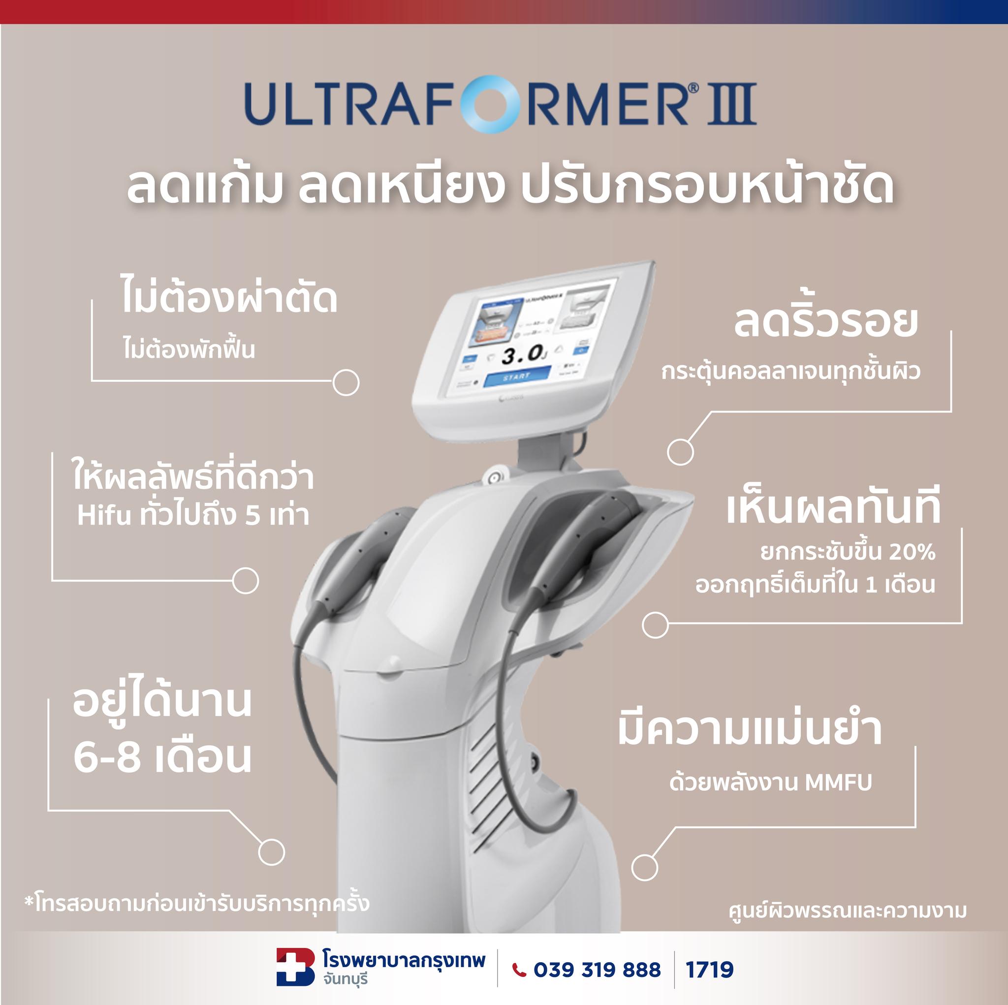 Ultraformer III คือ เครื่อง High Intensity Focus Ultrasound ที่ใช้สำหรับยกกระชับผิว กระตุ้นคอลลาเจน ช่วยลดริ้วรอยและทำให้ผิวเต่งตึง ทำงานโดยใช้การยิงคลื่นอัลตราซาวด์เข้าไปยังชั้นใต้ผิวหนังให้เกิดความร้อน ทำให้เนื้อเยื่อมีการหดตัวและทำให้ผิวชั้นบนยกกระชับขึ้น โดยไม่ต้องผ่าตัด หรือใช้เข็ม