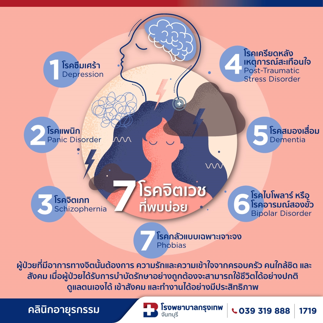 โรคจิตเวช คือกลุ่มอาการทางจิตใจหรือพฤติกรรมที่ทำให้ผู้ป่วยมีความบกพร่องในกิจวัตรต่าง ๆ หรือเกิดความทุกข์ทรมาน ซึ่งหลายคนไม่รู้ว่าตัวเองป่วย หรือบางคนรู้แต่ไม่มาพบแพทย์ ทำให้อาการหนักขึ้นเรื่อย ๆ จนนำไปสู่ภาวะแทรกซ้อนที่อันตรายถึงชีวิต โดยโรคจิตเวชที่พบบ่อยการสังเกตอาการคนรอบข้างรวมถึงตัวเองเกี่ยวกับโรคจิตเวชเป็นเรื่องสำคัญ หากพบความผิดปกติหรือส่งผลกระทบต่อการใช้ชีวิต ควรรีบปรึกษาจิตแพทย์เพื่อวินิจฉัยและวางแผนรักษาก่อนอาการรุนแรง