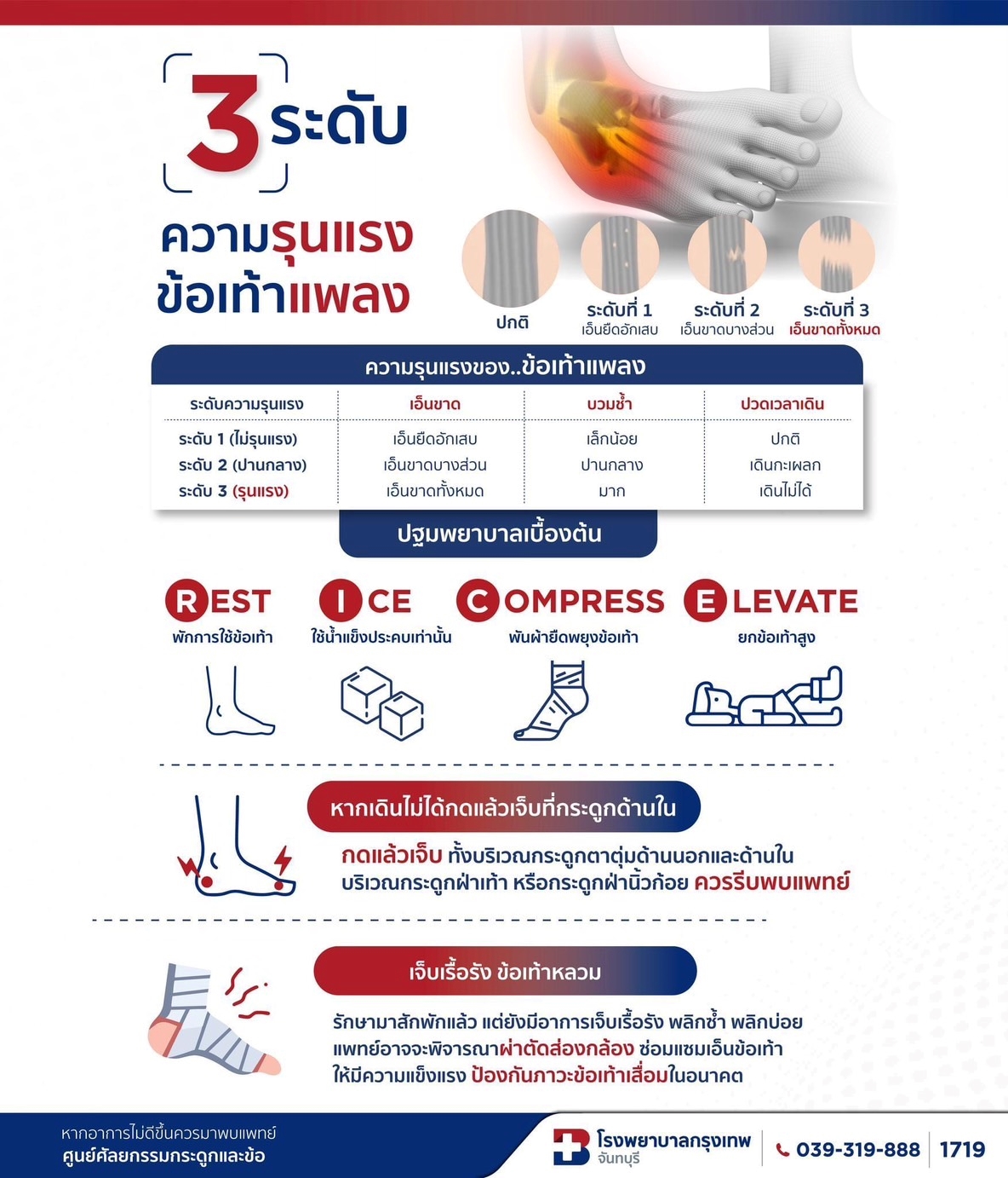 3 ระดับความรุนแรงของข้อเท้าแพง< 1 นาทีในการอ่านข้อมูลโดยโรงพยาบาลกรุงเทพจันทบุรีอัปเดตเมื่อ: 08 ต.ค. 2568โรงพยาบาลกรุงเทพจันทบุรีอัปเดตเมื่อ: 08 ต.ค. 2568สอบถามเพิ่มเติมที่คลินิกศัลยกรรมเท้าและข้อเท้า1st Floor, Building A08.00 - 20.00 น.039-319-888[email protected]แพทย์ที่เกี่ยวข้องดูแพทย์ทั้งหมดข้อมูลสุขภาพดูข้อมูลสุขภาพอื่น ๆข้อมูลสุขภาพการผ่าตัดรักษานิ้วหัวแม่เท้าเกรุนแรง (Hallux Valg)ภาวะเท้าแบนในเด็กและวัยรุ่นวิธีกายภาพหลังผ่าตัดเอ็นข้อเท้าดูข้อมูลสุขภาพอื่น ๆ