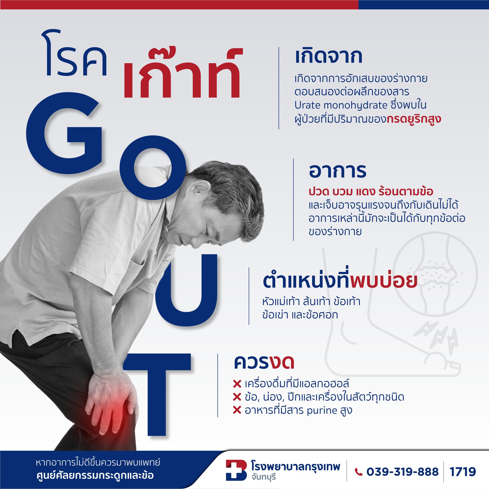 - ควรงดอาหารที่ทำให้อาการกำเริบ ได้แก่ เหล้า เบียร์ และอาหารที่มีสารพิวรีนสูง เช่น เครื่องในสัตว์ทุกชนิด เนื้อหมู เนื้อวัว กุ้ง หอย กุนเชียง ไส้กรอก สัตว์ปีก ถั่ว ชะอม กระถิน เป็นต้น