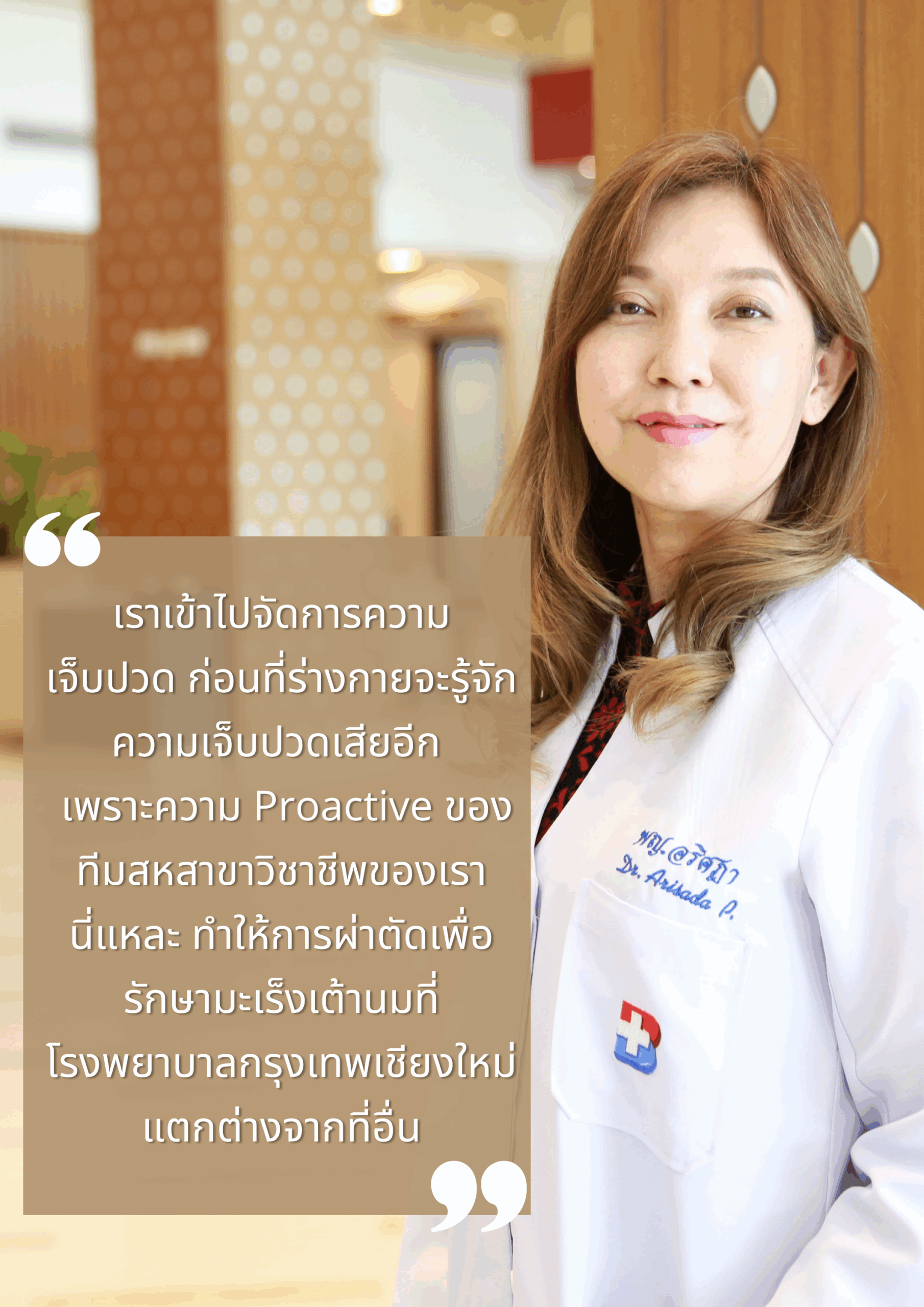 “เรียกได้ว่า เราเข้าไปจัดการความเจ็บปวด ก่อนที่ร่างกายจะรู้จักความเจ็บปวดเสียอีก เพราะความ Proactive ของทีมสหสาขาวิชาชีพ ทำให้การผ่าตัดรักษามะเร็งเต้านมที่โรงพยาบาลกรุงเทพเชียงใหม่ แตกต่างและมอบประสบการณ์ผ่าตัดที่ดีให้ผู้ป่วย”