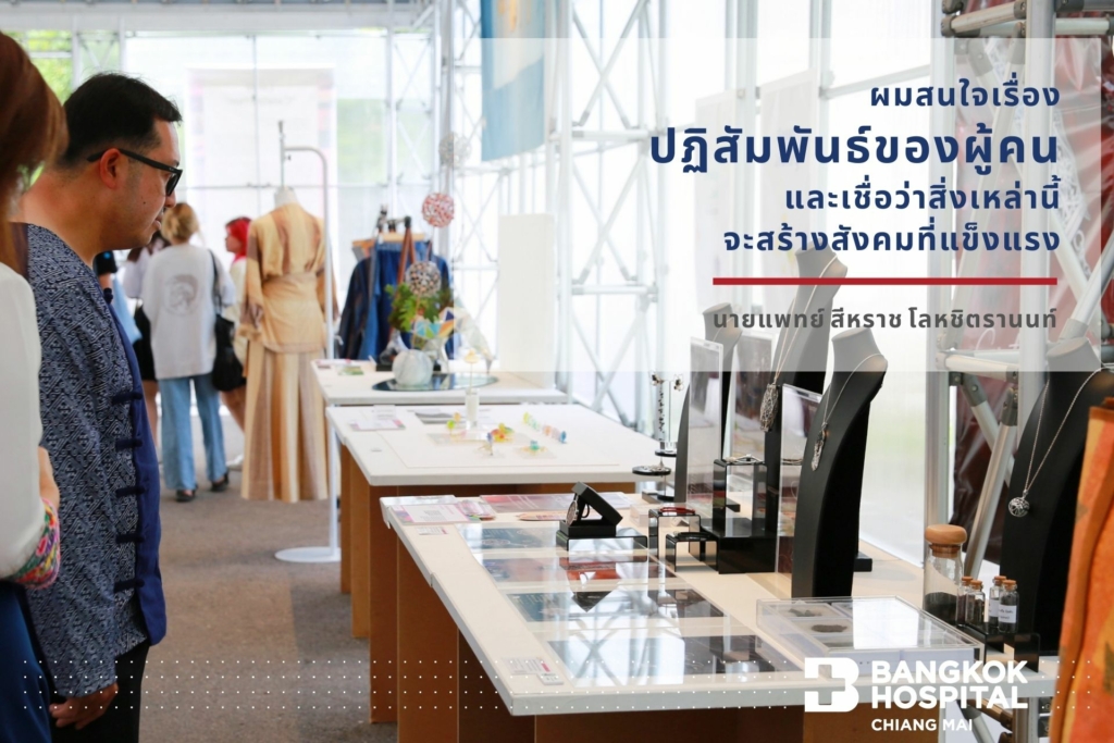 บทสนทนาดำเนินไปอย่างรื่นไหลระหว่างเดินชมนิทรรศการ สอดแทรกด้วยการสอบถามเรื่องราวที่เขาสนใจเป็นพิเศษยามเดินผ่านบูธต่าง ๆ เราเห็นความพยายามทำความเข้าใจในมิติชีวิตของคนล้านนา ผ่านการหยุดแวะชมดีไซน์เครื่องเงิน ผืนผ้า ผางประทีป หรือการมีส่วนร่วมจัดสรรพื้นที่สีเขียวในจังหวัดเชียงใหม่ เราจึงอดไม่ได้ที่จะสอบถามถึงมุมมองต่อผู้คน ในฐานะที่เป็นทั้ง ‘คุณหมอ’ และเป็น ‘ผู้บริหาร’