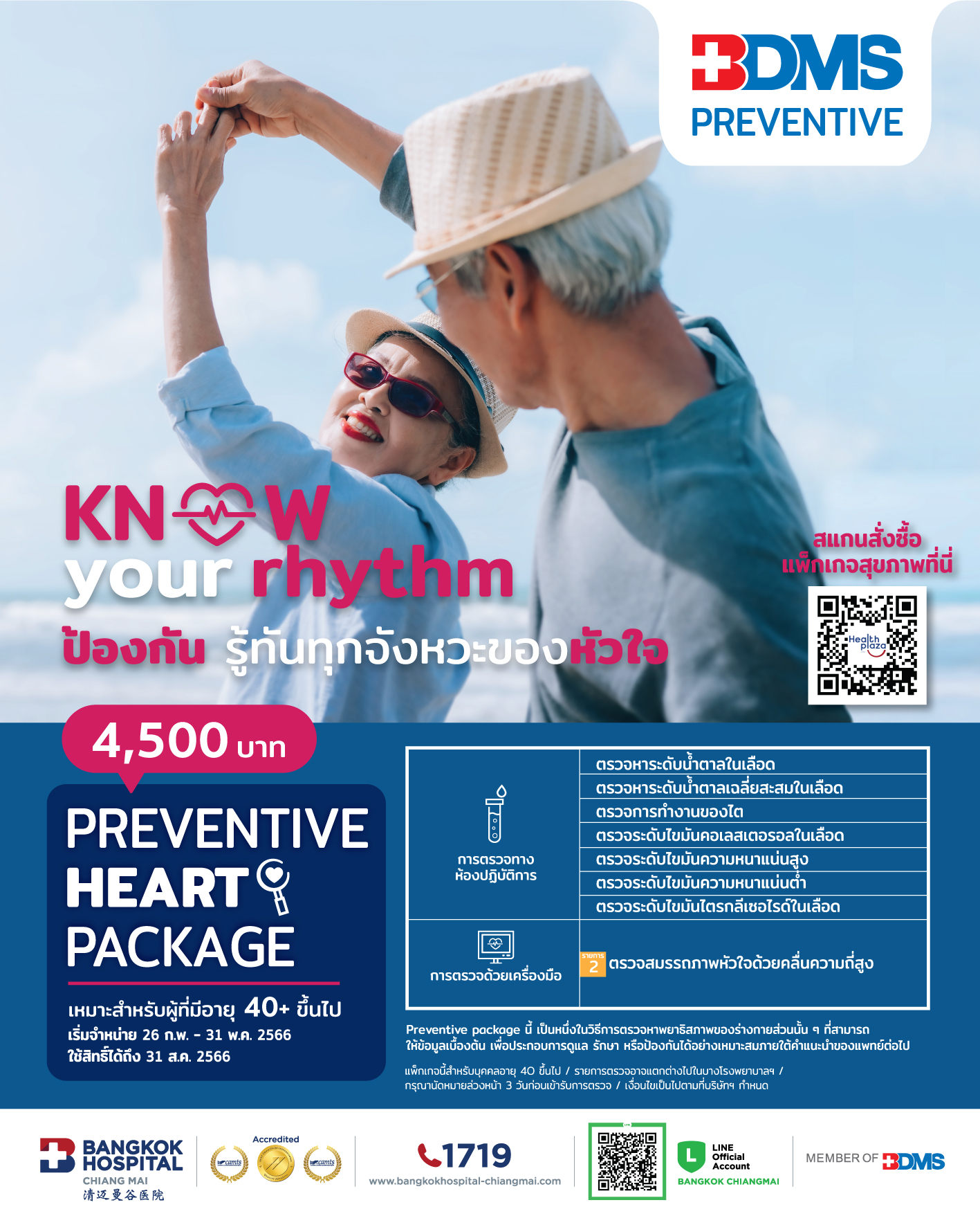 ในโอกาสครบรอบ 51 ปี ของ BDMS โรงพยาบาลกรุงเทพเชียงใหม่ร่วมกับโรงพยาบาลและคลินิกในเครือ ขอชวนท่านมา CHECK to PROTECT ตรวจเช็กสุขภาพหัวใจและสัญญาณเสี่ยงโรคมะเร็ง กับ BDMS Preventive Heart Package และ BDMS Preventive Cancer Package ในราคาแพ็กเกจละ 4,500 บาท เปิดจำหน่ายตั้งแต่วันที่ 26 กุมภาพันธ์ ถึง 31 พฤษภาคม นี้ โดยสามารถใช้บริการได้ถึงวันที่ 31 สิงหาคม 2566