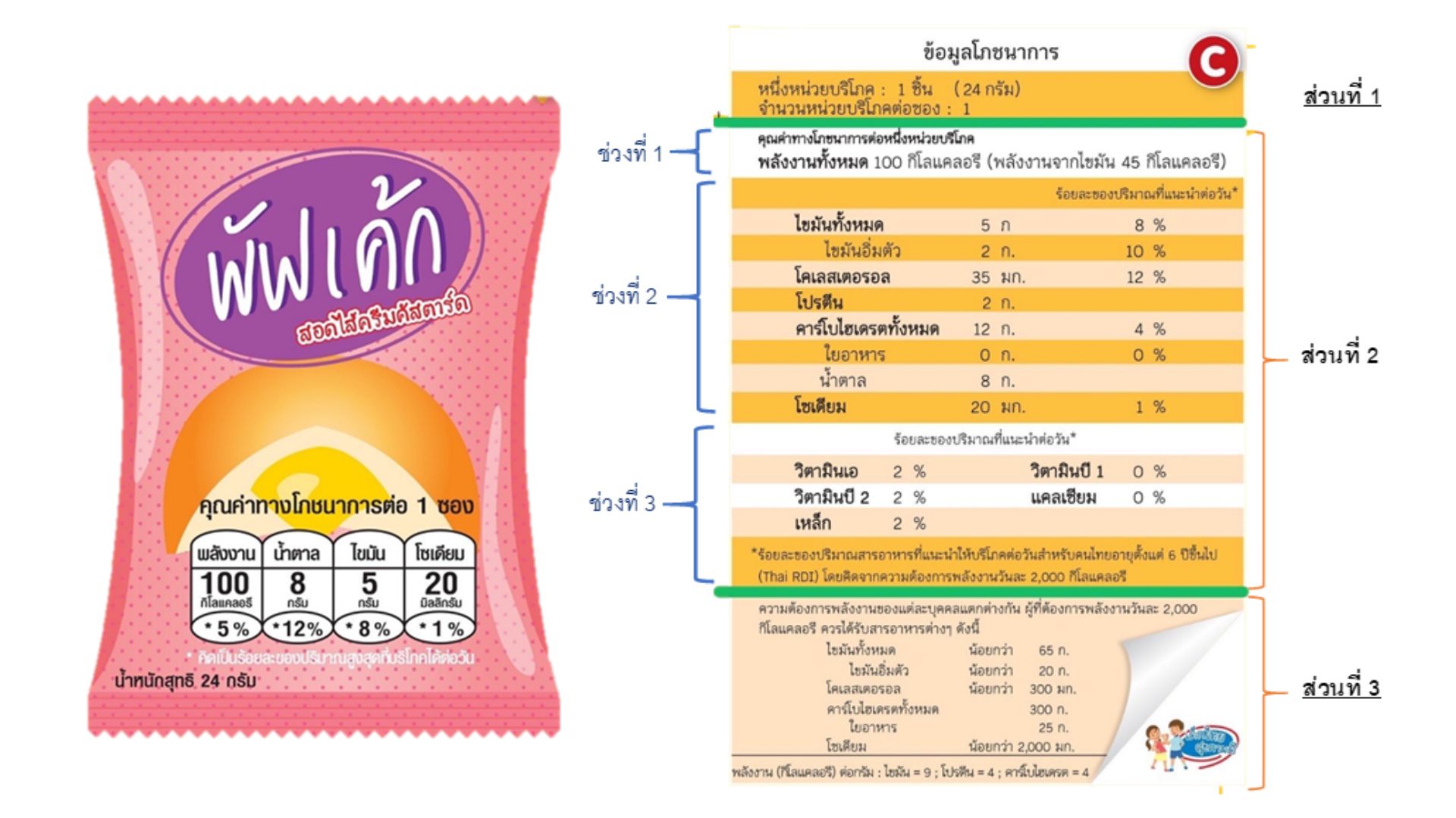 - ช่วงที่ 2 และช่วงที่ 3 บอกให้ทราบว่าเมื่อบริโภคอาหารชนิดนี้ จะได้สารอาหารอะไรบ้าง และคิดเป็นร้อยละเท่าไร ของความต้องการต่อวัน เช่น พัฟเค้ก สอดไส้ครีมคัสตาร์ด ซองนี้ มีน้ำตาล 8 กรัม ต้องการทราบว่ามีน้ำตาลกี่ช้อนชาให้นำ 8 หารด้วย 4 ได้ 2 แสดงว่ามีน้ำตาลอยู่ 2 ช้อนชา ต่อการบริโภค 1 ครั้ง