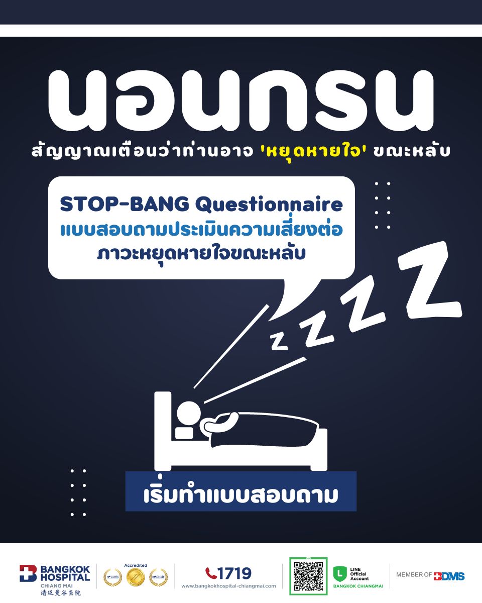 ภาวะหยุดหายใจขณะหลับ เป็นความผิดปกติอย่างหนึ่งของการหายใจที่เกิดขึ้นระหว่างนอนหลับ ซึ่งส่งผลกระทบต่อการใช้ชีวิตประจำวัน และทำให้เกิดความผิดปกติอื่นๆ กับร่างกาย ทุกคนสามารถประเมินความเสี่ยงต่อภาวะหยุดหายใจขณะหลับได้ด้วยแบบทดสอบด้านล่างนี้