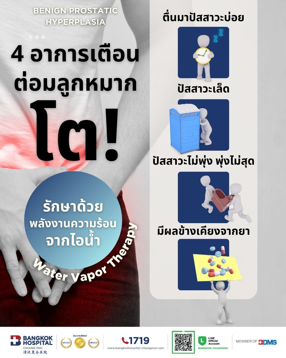 “ต่อมลูกหมากโต เรื่องที่ไม่ควรมองข้าม นอกจากทำให้เกิดความรำคาญอีกทั้งยังทำให้ขาดความมั่นใจ หากละเลยอาจทำให้ปัญหาลุกลามจนถึงขั้นตอนรับการผ่าตัด ดังนั้นหากมีอาการปัสสาวะที่ผิดปกติ ควรรีบมารับบริการการรักษากับแพทย์ผู้เชี่ยวชาญโดยด่วนเพื่อแก้ไขปัญหาและรักษาอย่างทันท่วงที”