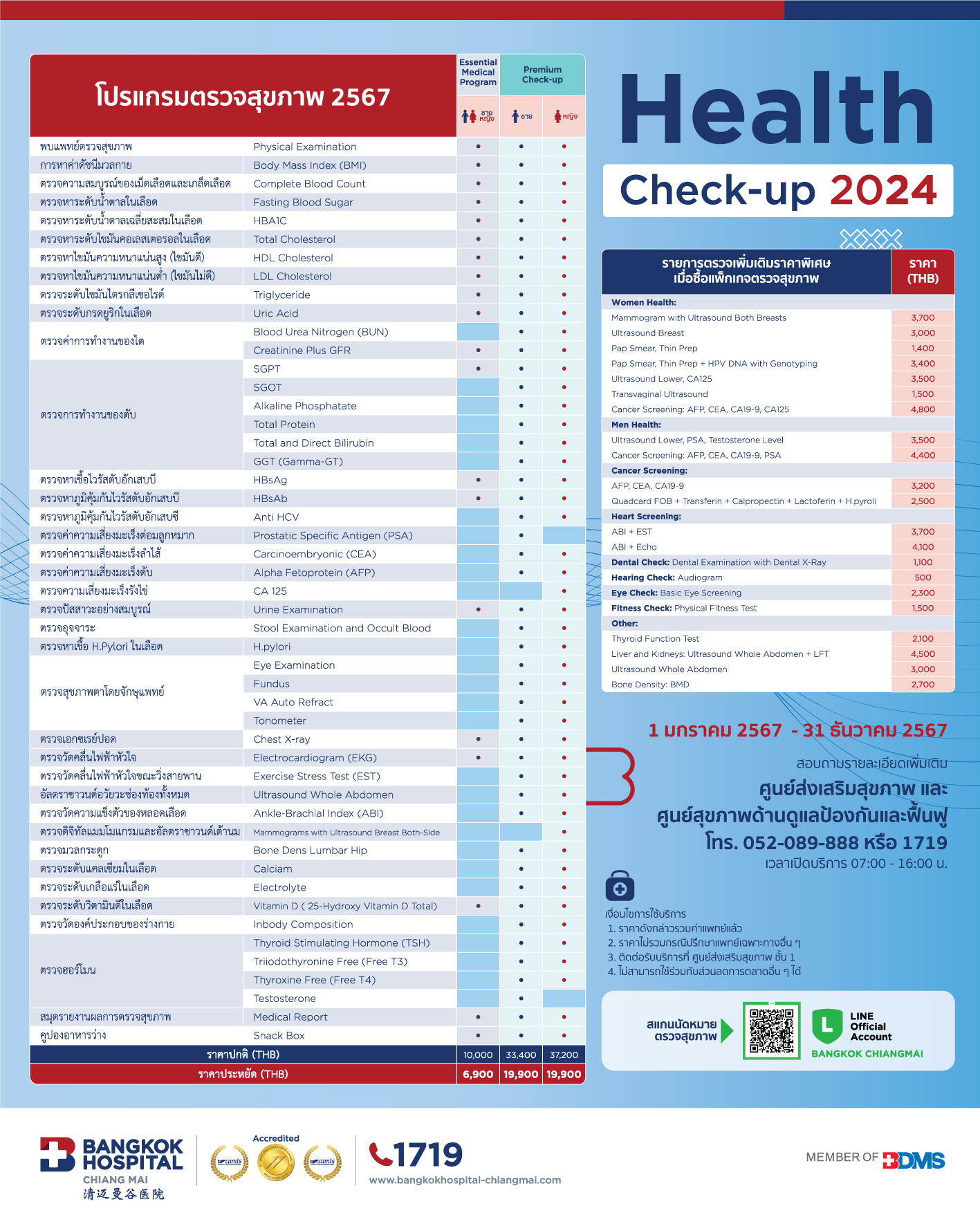 **กรุณานัดหมายล่วงหน้าก่อนเข้ารับการตรวจทุกครั้ง เพื่อความสะดวกรวดเร็วในการเข้ารับบริการ แผนก Health Promotion Center โรงพยาบาลกรุงเทพเชียงใหม่ ชั้น 1 โทร 052-089817 ทุกวันจันทร์ – อาทิตย์ ตั้งแต่เวลา 08.00- 16.00 น. หรือ โทร. 1719 ตลอด 24 ชั่วโมง**