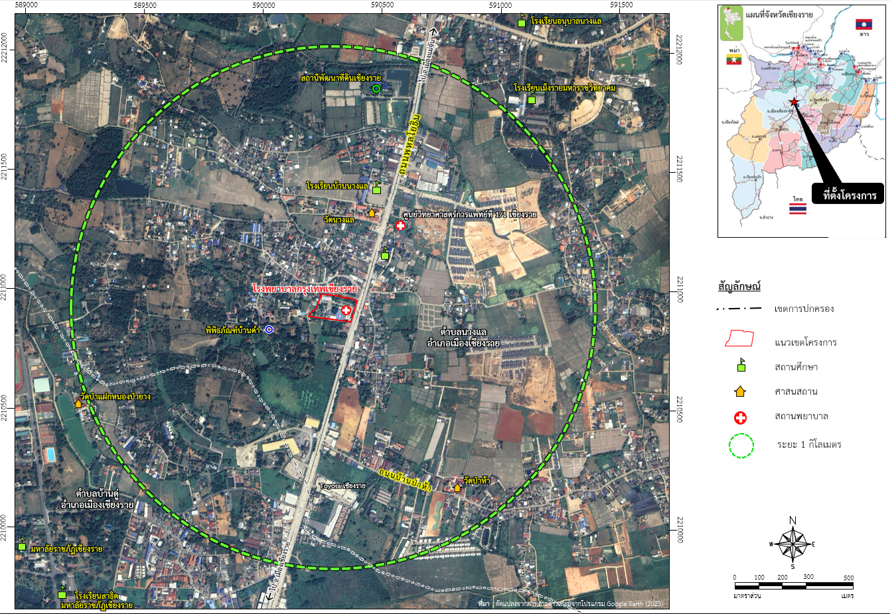 บริษัท โรงพยาบาลกรุงเทพเชียงราย จำกัด ได้รับใบอนุญาตให้ดำเนินการสถานพยาบาล ใบอนุญาตที่ ด.10201003264 เป็นโรงพยาบาลทั่วไป ขนาดกลาง ที่รองรับผู้ป่วยไว้ค้างคืน จำนวน 57 เตียง ออกให้วันที่ 17 มิถุนายน 2564 ใช้ได้ถึงวันที่ 31 ธันวาคม 2567 ต่อมา บริษัท โรงพยาบาลกรุงเทพเชียงราย จำกัด มีความประสงค์จะเพิ่มเตียงรองรับผู้ป่วยเพิ่มขึ้นจากเดิม “จำนวน 57 เตียง” เป็น “จำนวน 237 เตียง (เพิ่มขึ้นจากเดิม 180 เตียง) ” โดยปรับปรุงอาคาร คสล. 7 ชั้น บริเวณชั้น 4 และ 6 ภายในพื้นที่อาคารเดิม จำนวน 28 เตียง และก่อสร้างอาคารใหม่ คสล. 8 ชั้น และชั้นใต้ดิน 1 ชั้น ขนาด 152 เตียง โดยดำเนินโครงการเป็นโรงพยาบาลทั่วไป จัดเป็นโรงพยาบาลขนาดใหญ่ (ตั้งแต่ 91 เตียงขึ้นไป ตามกฎกระทรวงกำหนดลักษณะของสถานพยาบาลและลักษณะการให้บริการของสถานพยาบาล พ.ศ. 2558) มีความประสงค์จะเพิ่มเตียงรองรับผู้ป่วยเพิ่มขึ้นจากเดิม 1) ปรับปรุงอาคาร คสล.ขนาดความสูง 7 ชั้น จากเดิมจำนวน 57 เตียง และเพิ่มจำนวน 28 เตียงเป็นจำนวน 85 เตียง 2) ก่อสร้างก่ออาคารใหม่ คสล.ขนาดความสูง 8 ชั้น และชั้นใต้ดินขนาดความสูง 1 ชั้น จำนวน 152 เตียง ภายในโครงการประกอบด้วยอาคารโรงพยาบาล เป็นอาคาร คสล. 8 ชั้น และชั้นใต้ดิน 1 ชั้น จำนวน 1 อาคาร อาคารพักแพทย์ ขนาดความสูง 3 ชั้น อาคารห้องพักมูลฝอยรวม ขนาดความสูง 1 ชั้น จำนวน 1 อาคาร อาคารห้องผ้า ความสูง 1 ชั้น จำนวน 1 อาคาร และอาคารพื้นที่ให้เช่า พื้นที่ใช้สอยอาคารรวม 33,860.37 ตารางเมตร พร้อมที่จอดรถยนต์ 144 คัน และที่จอดรถจักรยานยนต์ 23 คัน โครงการคาดว่าจะใช้ระยะเวลาก่อสร้างอาคารประมาณ 24 เดือน โดยในช่วงแรกของการก่อสร้างจะเป็นงานรื้อถอนอาคารเดิม จนถึงขั้นตอนการก่อสร้างแล้วเสร็จสมบูรณ์