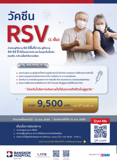 วัคซีน RSV (1เข็ม) สำหรับผู้ที่มีอายุ 60 ปีขึ้นไป หรือ ผู้ที่อายุ50-60 ปี ที่มีโรคประจำตัว เช่น โรคอุดกั้นเรื้อรัง, หอบหืด,กล้ามเนื้อหัวใจขาดเลือด