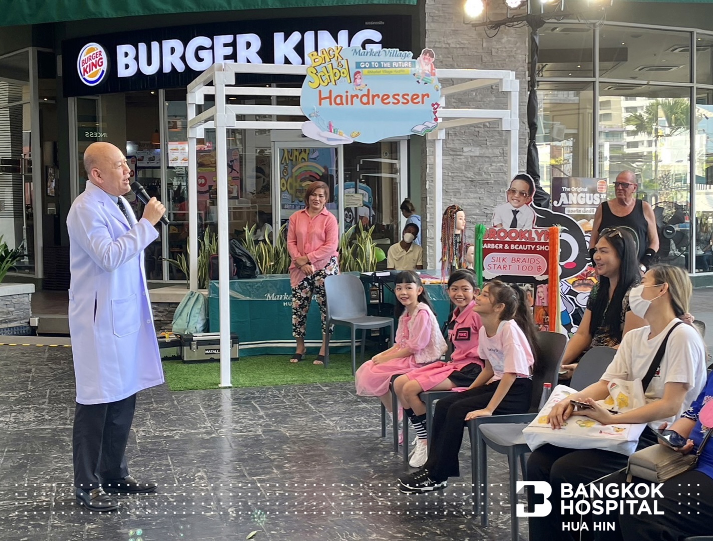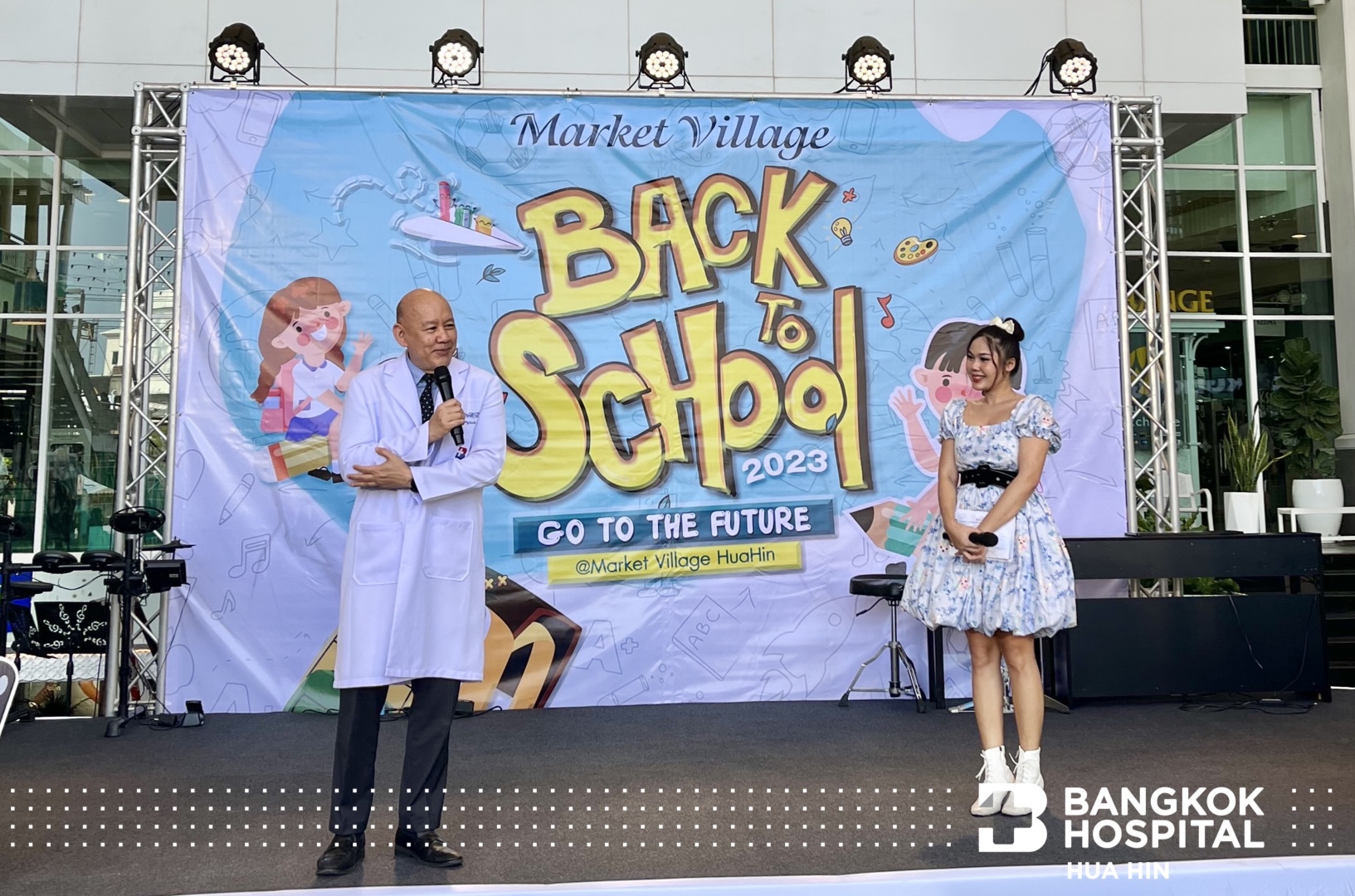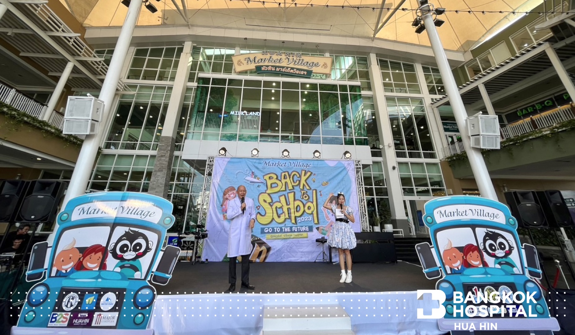 👨🏻⚕️🩺 โรงพยาบาลกรุงเทพหัวหิน ร่วมกิจกรรม Back to School, Go to the Future จัดโดย ศูนย์การค้ามาร์เก็ตวิลเลจหัวหิน โดย นพ.พงษ์ศักดิ์ บุญยะลีพรรณ ผู้ช่วยผู้อำนวยการรพ.กรุงเทพหัวหิน ร่วมเป็นวิทยากรให้ความรู้สายอาชีพแพทย์ พร้อมด้วยเจ้าหน้าที่ออกบูธประชาสัมพันธ์ ณ ลานกิจกรรมด้านหน้าศูนย์การค้ามาร์เก็ตวิลเลจหัวหิน เมื่อวันที่ 26 – 27 พฤษภาคม 2566 และ