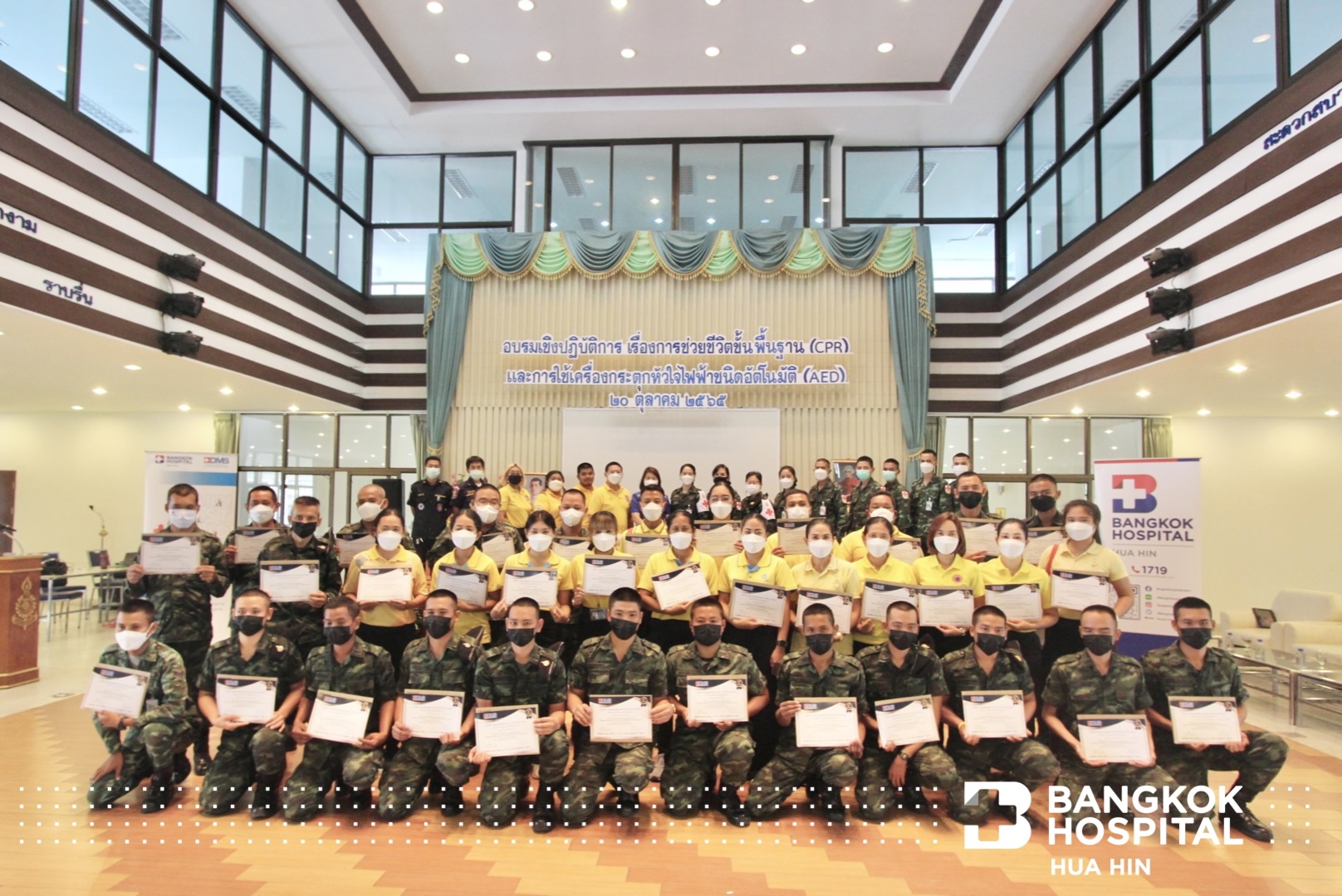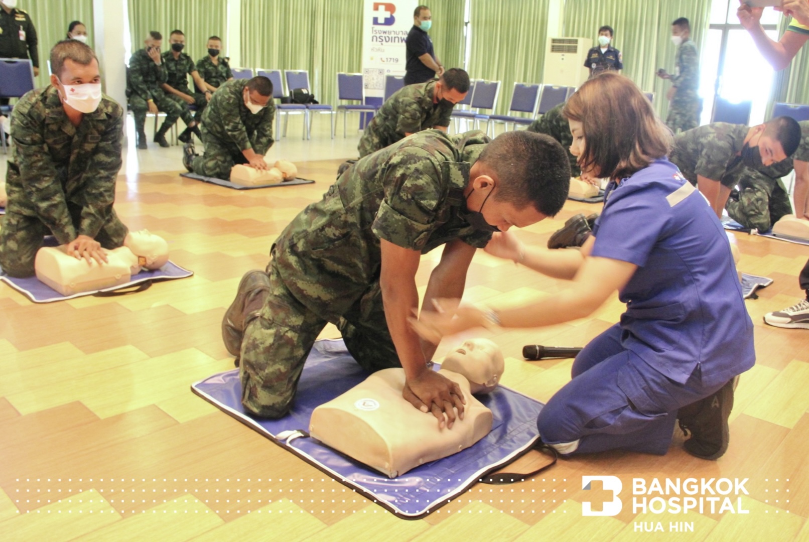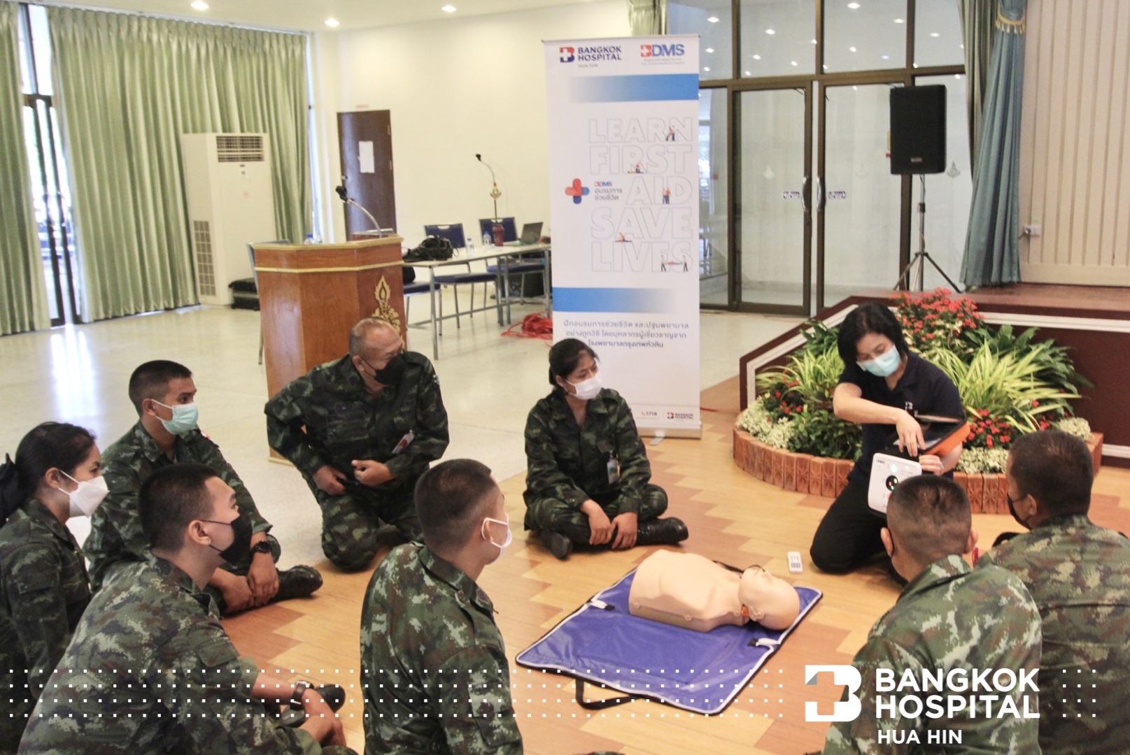 โรงพยาบาลกรุงเทพหัวหิน จัดโครงการ 𝗕𝗗𝗠𝗦 อบรมการช่วยชีวิต รุ่นที่ 7 ให้กับบุคลากรทางการแพทย์ สมาชิกแม่บ้านทหารบก สาขาโรงเรียนนายสิบทหารบก และเจ้าหน้าที่อุทยานราชภักดิ์ โดยมี พ.อ.ยงยุทธ หาญสมศรี รองผู้บัญชาการ โรงเรียนนายสิบทหารบก เป็นประธานในพิธีเปิดงาน พร้อมด้วย นพ.พงษ์ศักดิ์ บุญยะลีพรรณ ผู้ช่วยผู้อำนวยการ รพ.กรุงเทพหัวหิน ร่วมพิธี