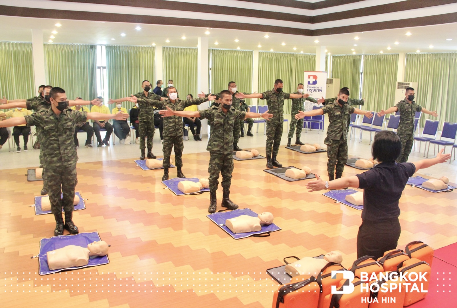 โครงการนี้จัดอบรมโดยวิทยากรผู้เชี่ยวชาญจากรพ.กรุงเทพหัวหิน ทั้งภาคทฤษฎีและการฝึกปฏิบัติจริงในการช่วยชีวิต การปั๊มหัวใจ (CPR) การใช้เครื่องกระตุกหัวใจด้วยไฟฟ้าชนิดอัตโนมัติ (AED) และการช่วยเหลือผู้ป่วยสำลักอุดกั้นทางเดินหายใจ โดยผู้ที่ผ่านการฝึกอบรมได้รับมอบประกาศนียบัตรภายในงาน ณ แหล่งสมาคม โรงเรียนนายสิบทหารบก ค่ายโยธินศึกษามหามงกุฎ ต.หนองแก อ.หัวหิน จ.ประจวบคีรีขันธ์ เมื่อวันที่ 20 ตุลาคม 2565